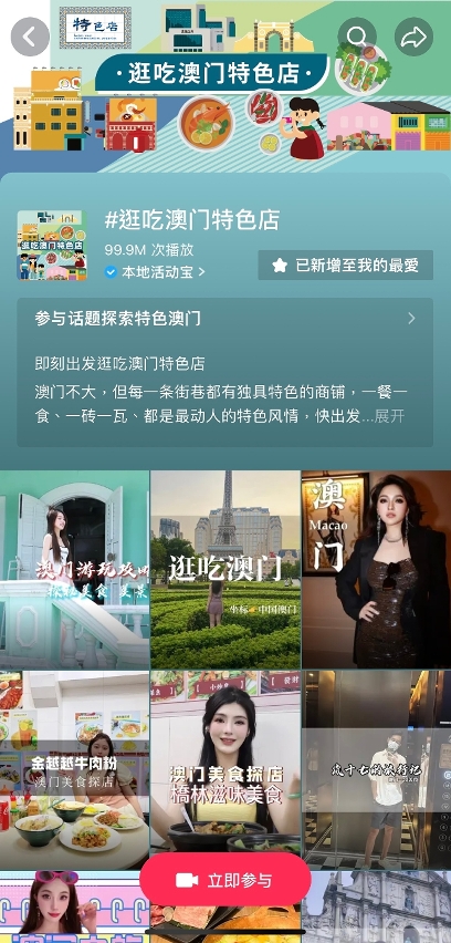 標籤“逛吃澳門特色店”話題的三批影片自今年6月發起至今,已累計錄得近1億次播放量,多條影片更登上“抖音熱榜”,有助吸引旅客深入澳門各區探店尋味,促進社區經濟。
