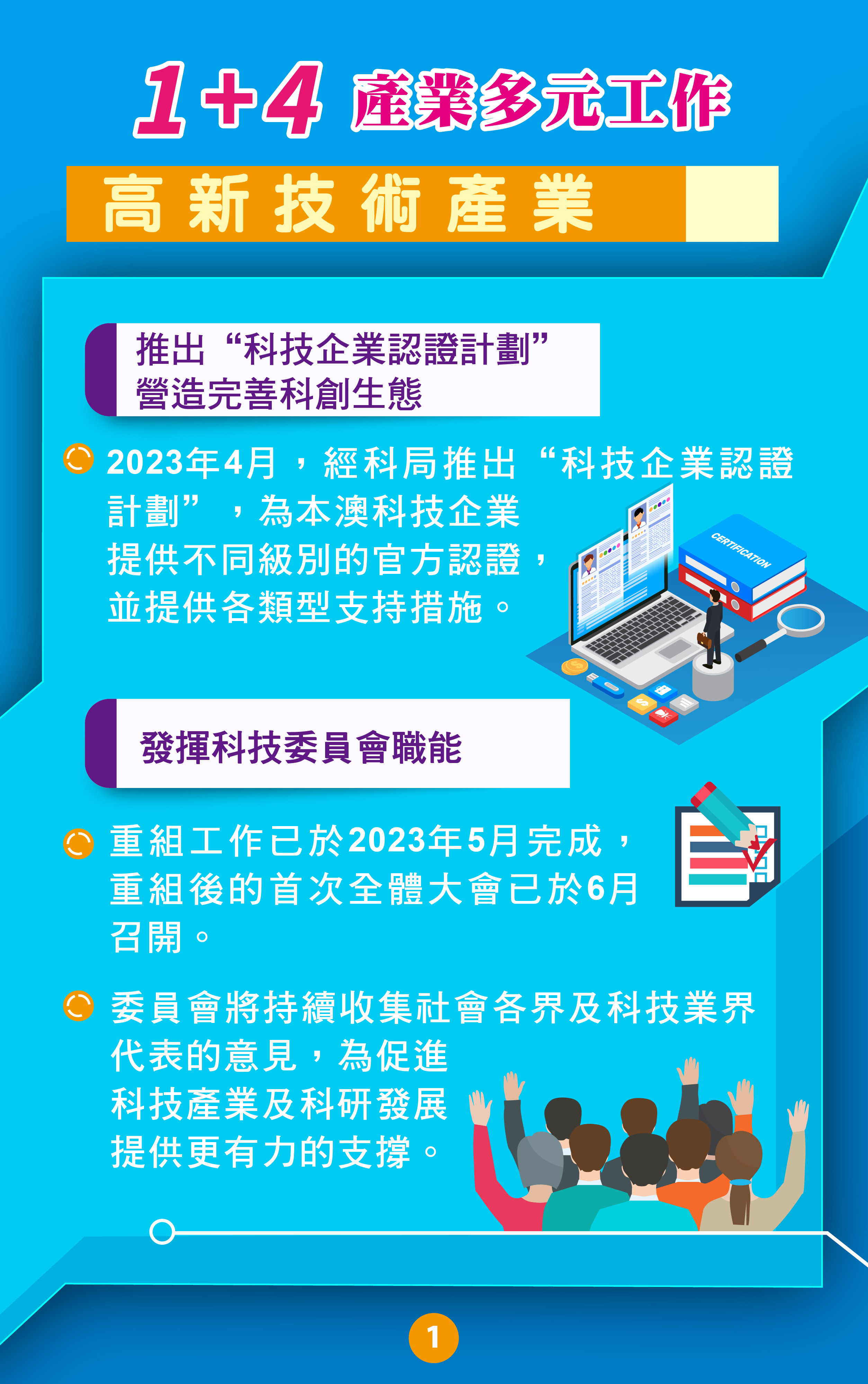 特區政府正積極推進“1+4”適度多元發展策略,其中包括高新技術。近年,特區政府在促進科技產業發展上,已進行了多項工作,包括推動企業和科研機構產學研合作、促進與內地及葡語國家的科技交流合作等。特區政府亦透過推出各項支持政策和活動項目,為科技產業發展營造更好的政策環境,推動科技創新及高新技術產業發展。