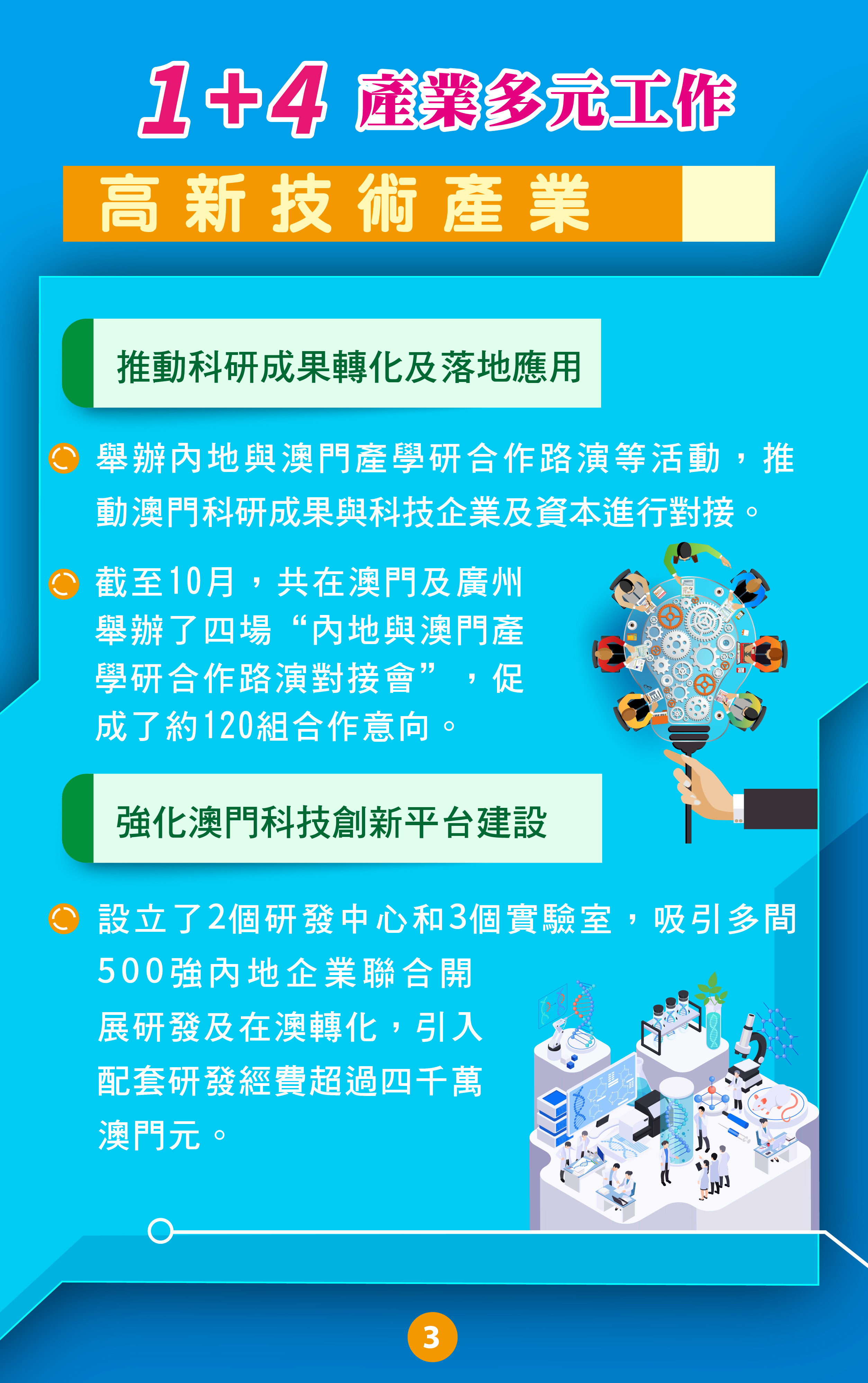 特區政府正積極推進“1+4”適度多元發展策略,其中包括高新技術。近年,特區政府在促進科技產業發展上,已進行了多項工作,包括推動企業和科研機構產學研合作、促進與內地及葡語國家的科技交流合作等。特區政府亦透過推出各項支持政策和活動項目,為科技產業發展營造更好的政策環境,推動科技創新及高新技術產業發展。