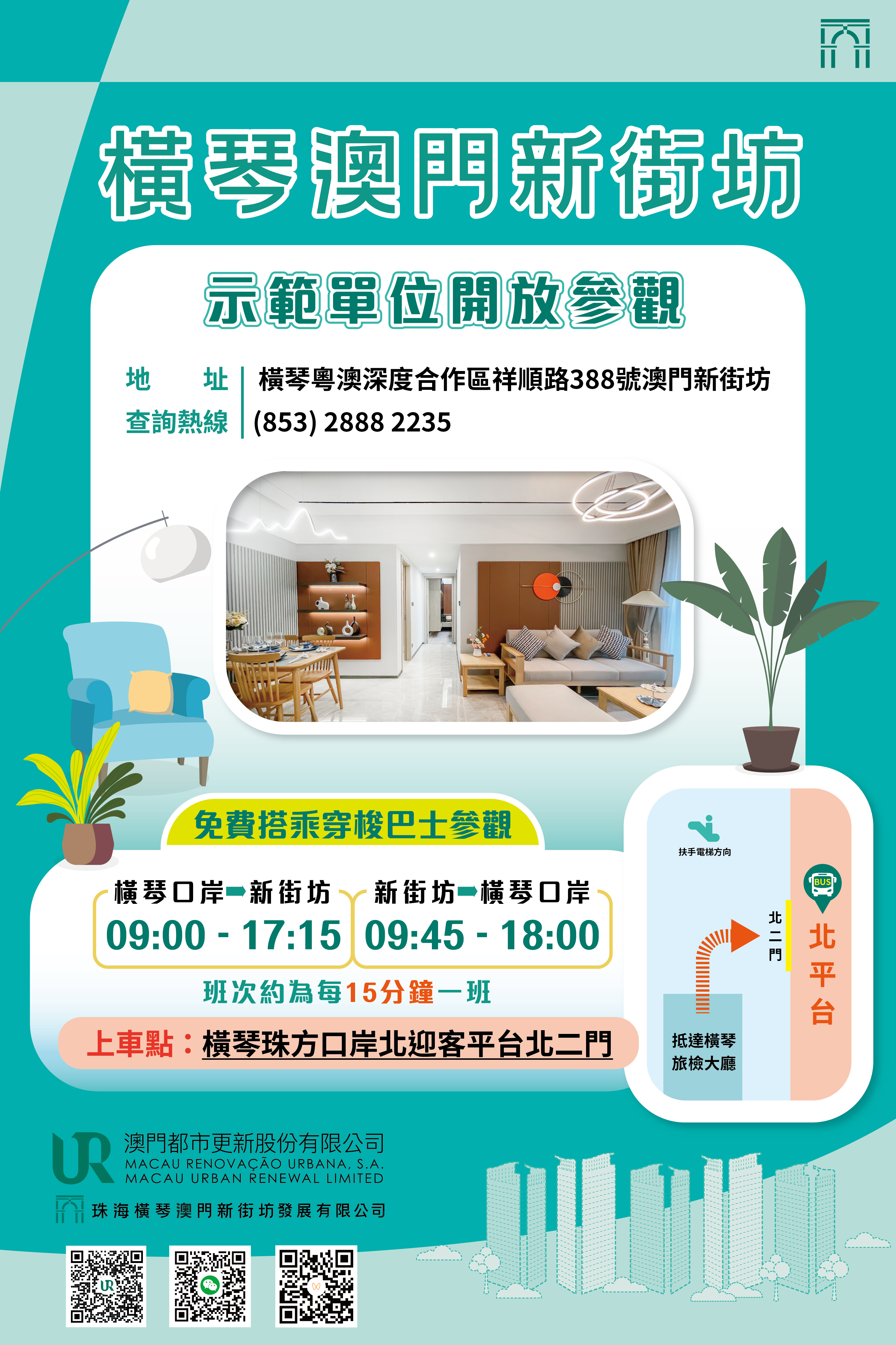 此次合共展示11個住宅單位,包括兩房、三房示範單位及樣板房,開放時間為周一至周日上午9時至下午6時(內地法定節假日除外)。有意前往參觀的市民可乘坐澳門新街坊穿梭巴士,專車從橫琴口岸(珠方口岸)北迎客平台北2門候車停泊區出發,每日首班穿梭巴士發車時間為上午9時,尾班車發車時間為下午5時15分,約15分鐘一班次。此外,項目亦設有臨時停車區域方便自駕人士停泊。