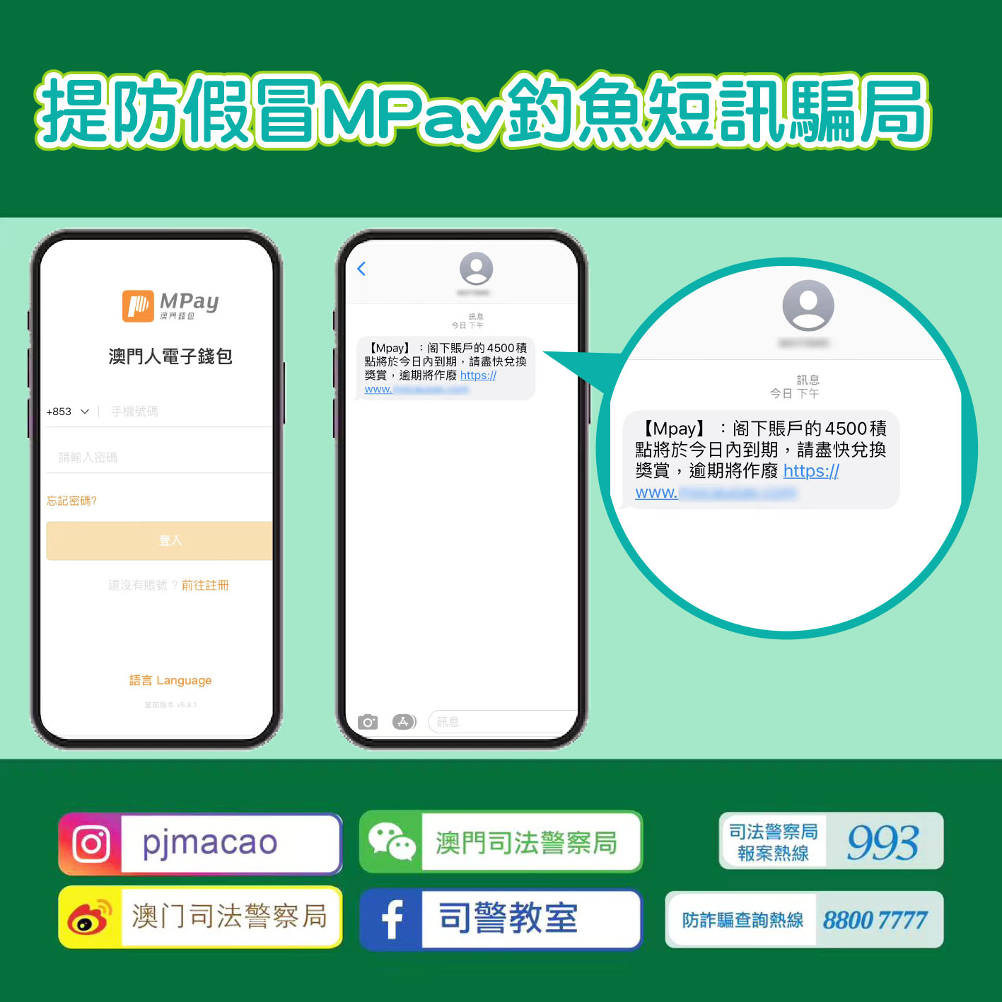 司法警察局今年接獲多名市民舉報,稱收到不同類型的釣魚短訊。為此司警局亦多次針對假冒不同通訊軟件、消費獎賞平台及支付平台等的釣魚短訊作出警情呼籲。而司警局於2023年10月24日亦再次就“MPay釣魚短訊”發出警情通告,惟在10月25日至11月3日期間,再接獲11名市民就“假冒MPay釣魚短訊”的檢舉,報稱造成損失金額接近八萬澳門元。