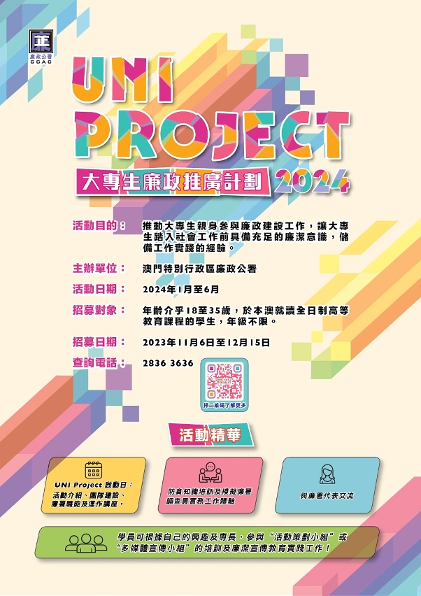 為致力推動大專生參與廉政建設,廉政公署持續深化與本澳大專院校合作,舉辦“UNI Project─大專生廉政推廣計劃2024”。活動名稱中的UNI是英文University and Integrity的縮寫。廉署期望透過一系列培訓和倡廉實踐工作,讓大專生在踏入社會工作前提高廉潔意識,累積工作實踐的經驗。活動由即(6)日起至2023年12月15日招募學員,歡迎18至35歲正就讀本澳全日制高等教育課程的學生報名參加。