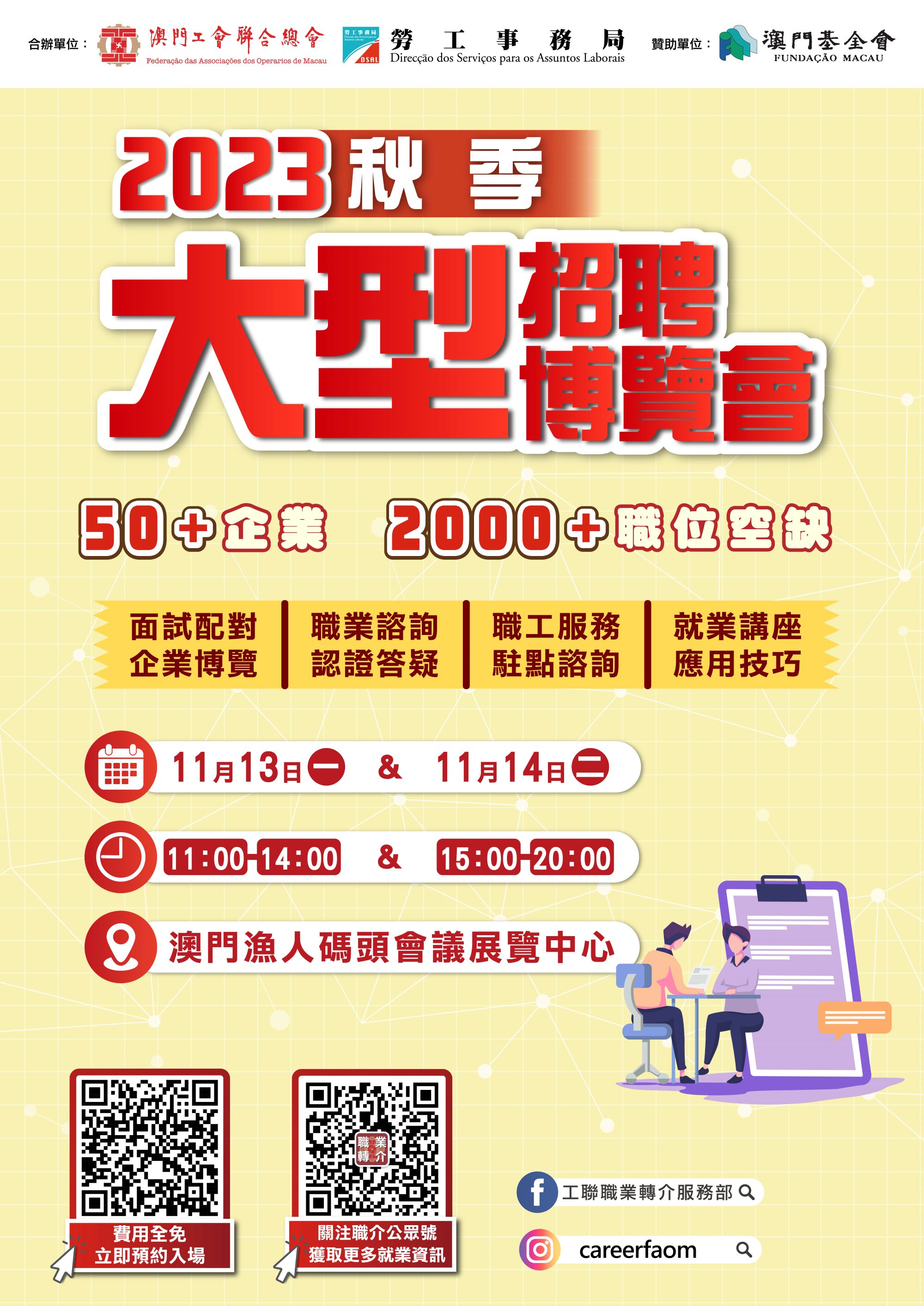 為著力拓寬就業渠道,進一步促進居民就業,勞工事務局與澳門工會聯合總會於11月13日及14日假澳門漁人碼頭會議展覽中心合辦「2023秋季大型招聘博覽會」,有意參加者可於11月10日中午12時前網上預約入場,報名情況踴躍,把握機會報名,名額有限,欲報從速。