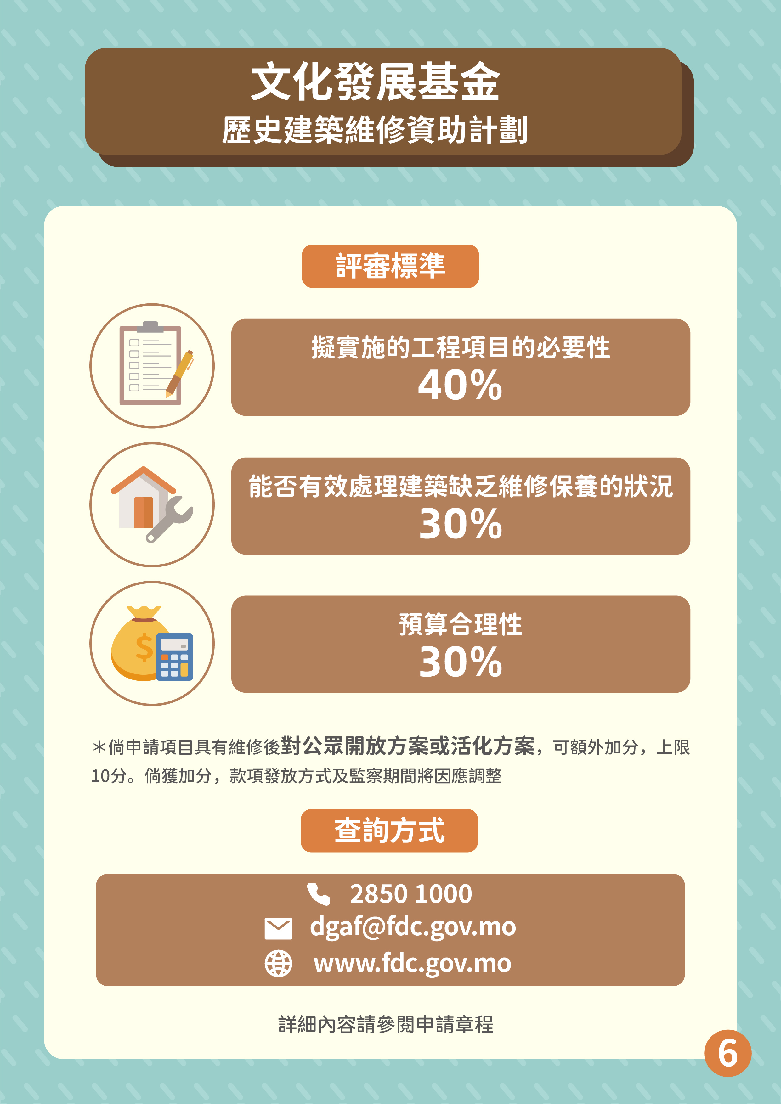 文化發展基金為加強推動歷史建築的保護和活化,推出“歷史建築維修資助計劃”,透過資助提升業權人自主開展定期維修保養的積極性,加強對文物建築和具文化價值建築的保護。