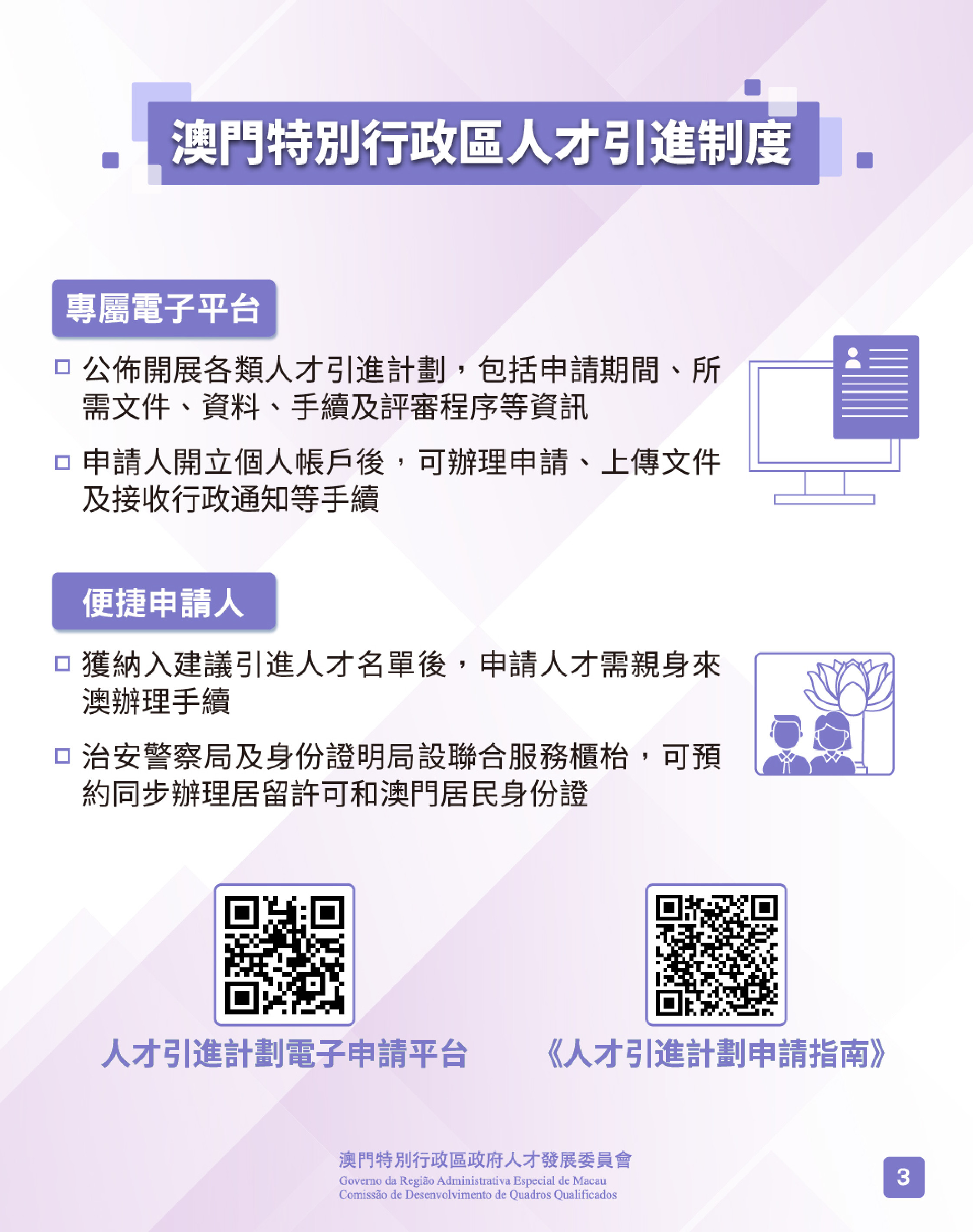 人才引進計劃電子申請平台設有公告欄,公佈開展各類人才引進計劃,並載有《人才引進計劃申請指南》,列明申請所需文件及資料、申請步驟、適用的評審準則等相關詳細資料。申請人透過電子平台開立個人帳戶後,可辦理申請、上傳文件及接收行政通知等手續。