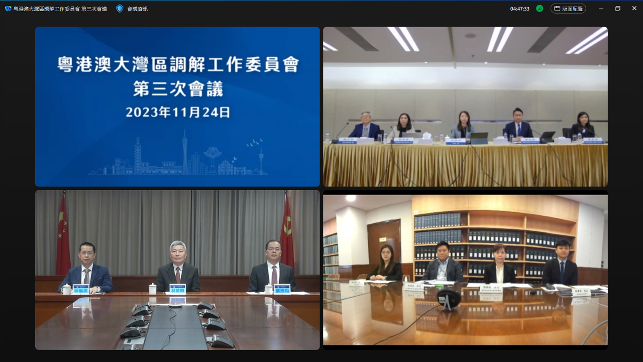 粵港澳大灣區調解工作委員會於11月24日以視像方式舉行第三次會議,澳門特區政府法務局局長梁穎姸、廣東省司法廳副廳長林楚明、香港特區政府律政司署理高級助理民事法律專員鄧頴茹等出席。
