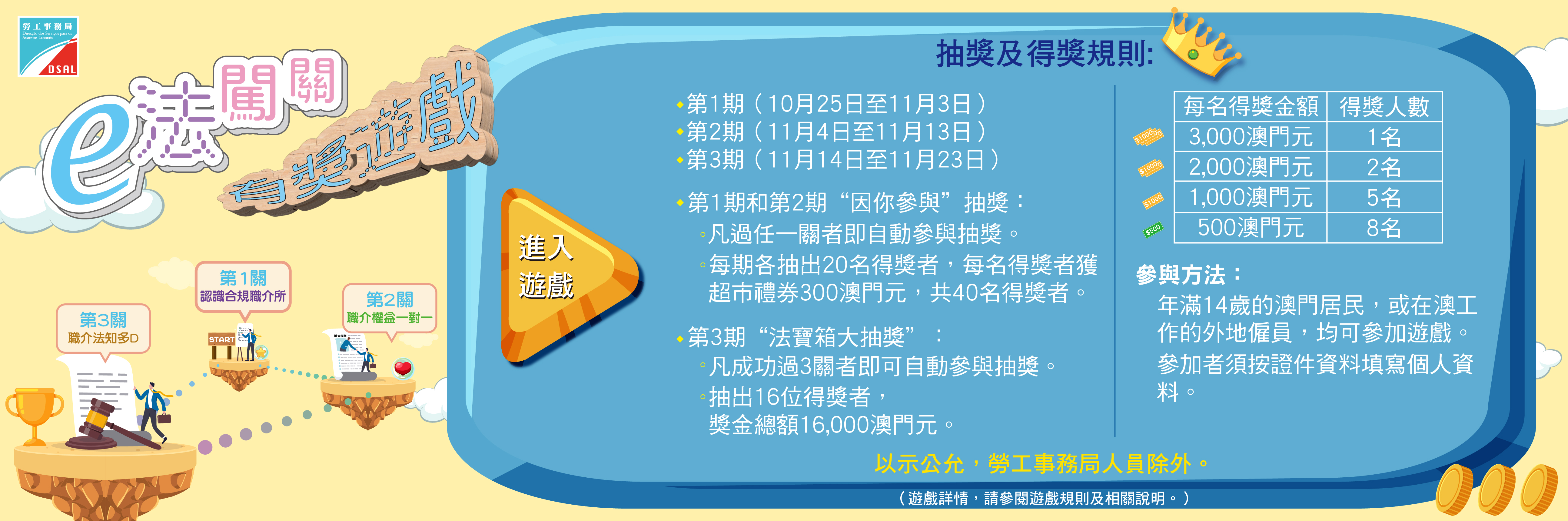 「e法闖關」網上有獎遊戲共有三關,活動期間分別以“因你參與”和“法寶箱大抽奬”進行三期自動參加抽獎。第一及第二期抽出共40名得獎者,每名得獎者獲超市禮券300澳門元。凡成功過3關的參加者,更可自動參加“法寶箱大抽奬”,總獎金高達16,000澳門元,分別獲得: 3,000澳門元( 1名)、2,000澳門元( 2名)、1,000澳門元( 5名)、500澳門元( 8名) 。