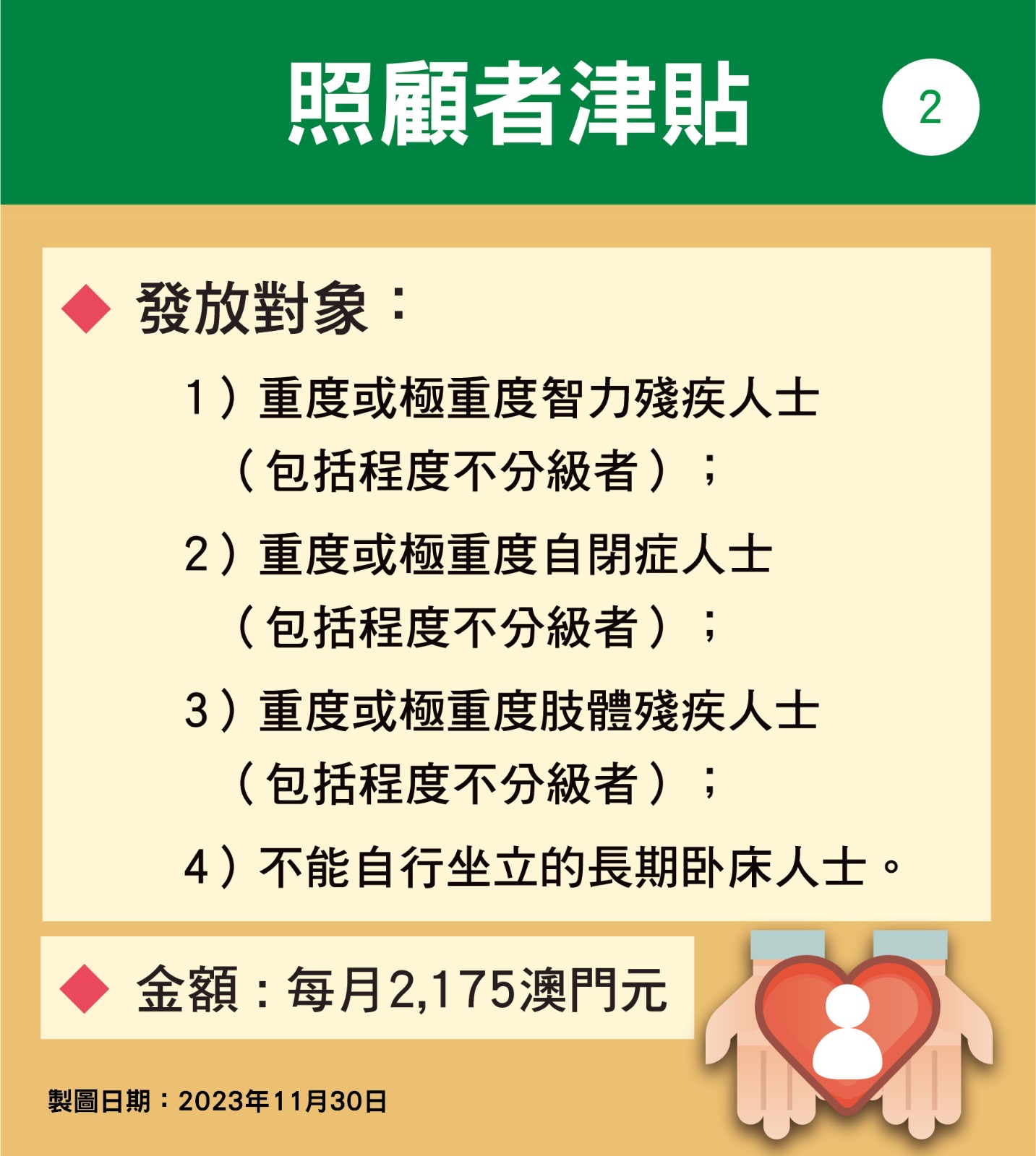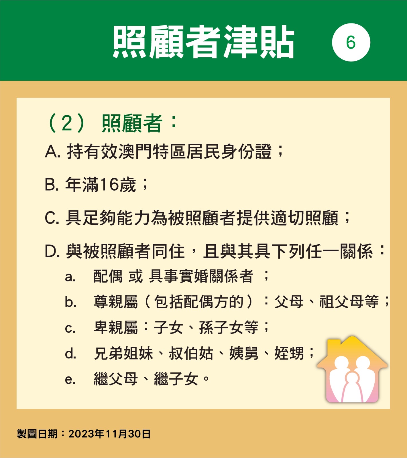 第95/2023號社會文化司司長批示核准的《照顧者津貼發放規章》(下稱規章)於12月1日開始生效,照顧者津貼正式轉為恆常性措施。規章訂定了有關津貼的發放制度與相關安排,社會工作局將按照規章的規範內容,跟進有關申請、審批、發放、監察和覆查等工作。