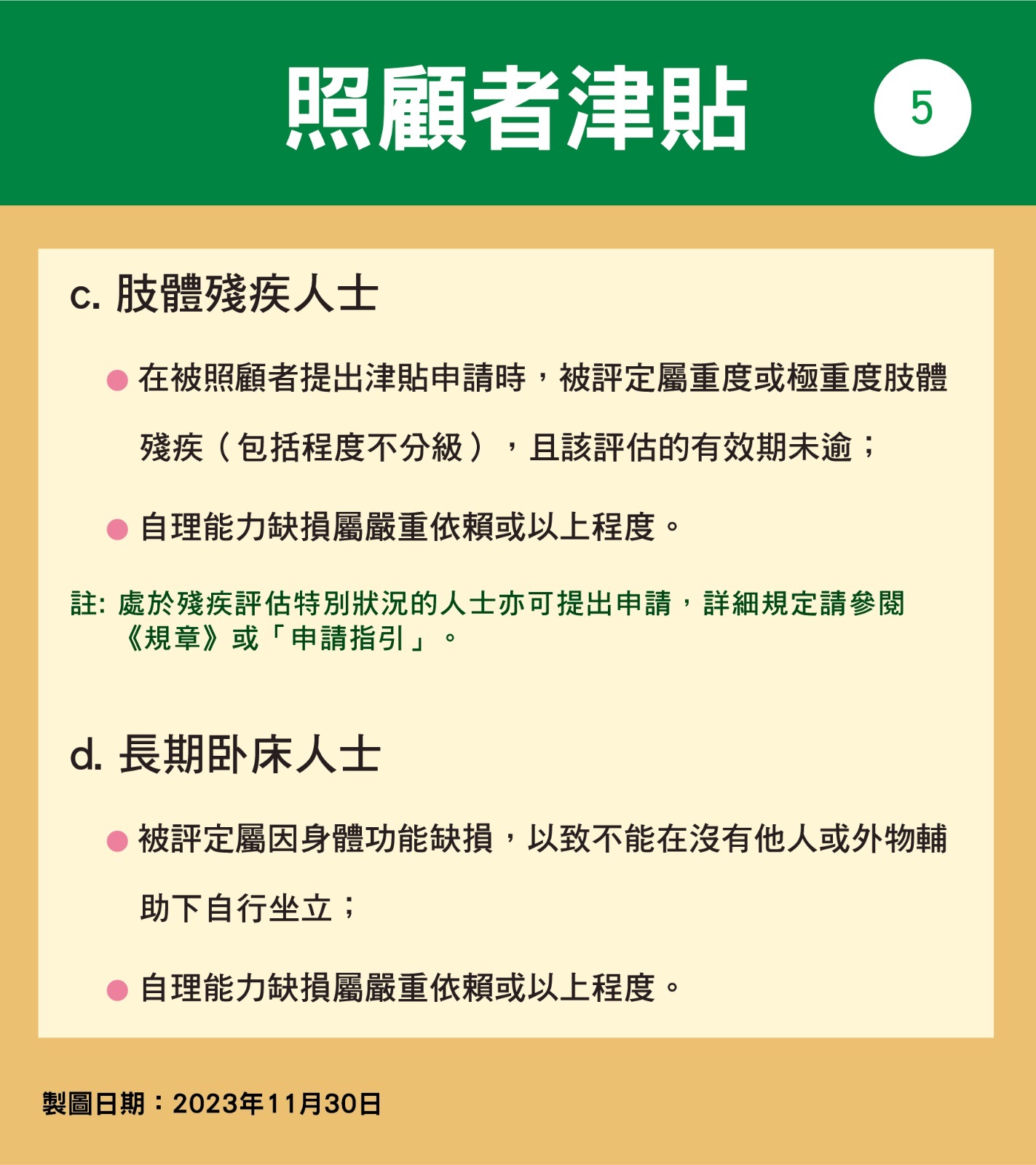 照顧者津貼轉為恆常性措施後,政策目的維持不變,旨為經濟條件薄弱、且在生活自理方面具長期及密集照顧需要的人士提供特別援助,以關懷其生活照顧上的需要。符合規章所定下列要件的四類人士,可按相關規定向社會工作局遞交申請,不設截止期限: