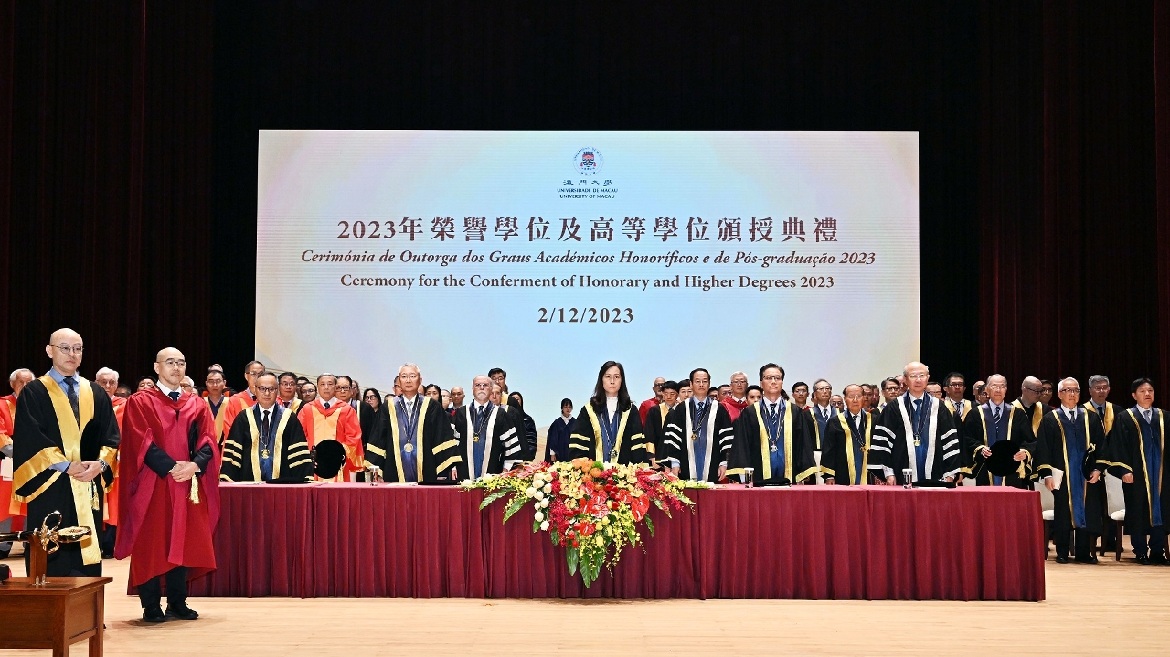 澳門大學今(2)日舉行2023年榮譽學位及高等學位頒授典禮,向五位傑出人士:蔡昉、梁錦榮、汪正平、佛朗哥‧馬洛貝爾蒂(Franco Maloberti)及王士元頒授澳大榮譽博士學位,以表彰其卓越成就及為社會所作出的重大貢獻。