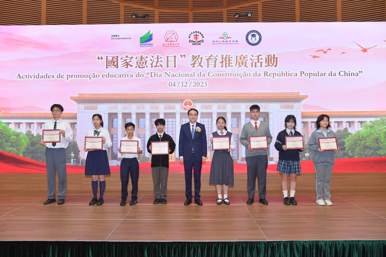 為加深青年學生對《憲法》和《基本法》的認識,教育及青年發展局聯同澳門中華教育會、澳門天主教學校聯會、澳門公職教育協會及澳門高等教育發展促進會於12月4日在澳門科學館會議廳舉辦國家憲法日教育推廣活動。社會文化司司長歐陽瑜、中央人民政府駐澳門特別行政區聯絡辦公室教育與青年工作部部長李雪飛、教育及青年發展局局長龔志明、澳門基金會行政委員會委員區榮智、教青局副局長丁少雄、阮佩賢及黃嘉祺、澳門中華教育會會長陳虹、理事長鄭洪光、澳門高等教育發展促進會會長莫啓明、澳門天主教學校聯會會長周伯輝、澳門公職教育協會會員大會主席劉文堯、教育委員會委員、青年事務委員會委員、澳門高等院校及非高等教育學校校長及代表,以及教青局主管等出席。