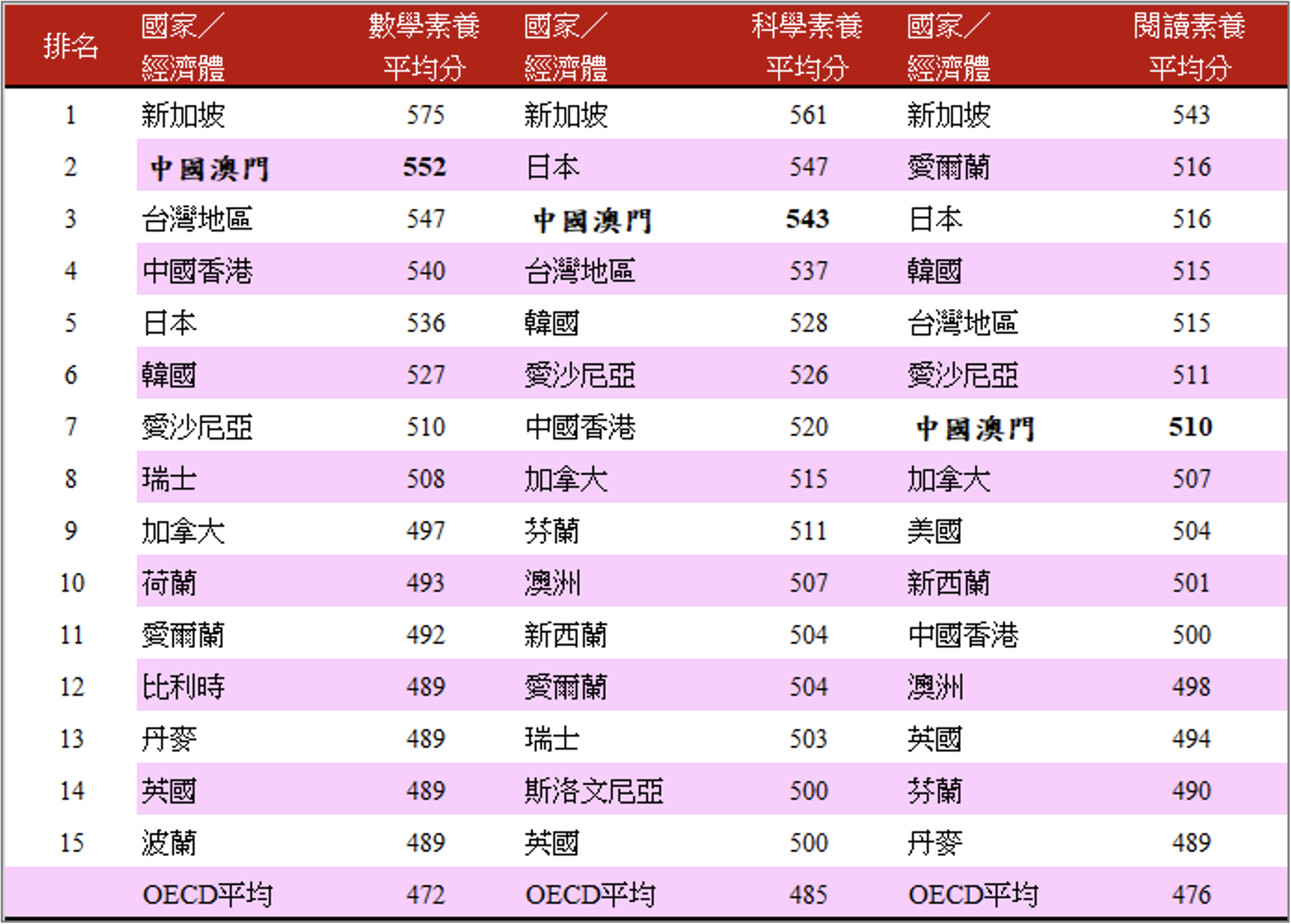 表1:PISA 2022 數學、科學和閱讀素養排名前15個國家/經濟體的平均成績