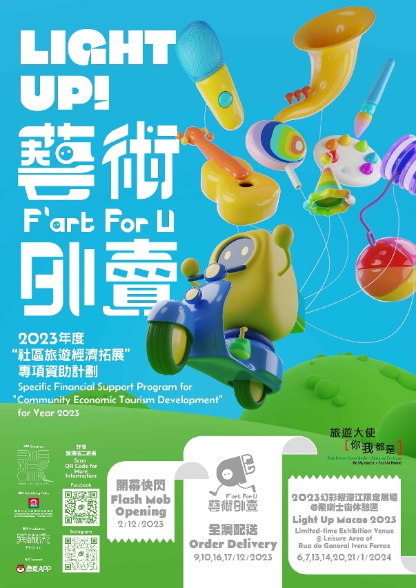 有關以上活動詳情可向相關主辦單位查詢:“幻彩冰雪樂園”(澳門北區工商聯會主辦)、“Light Up!藝術外賣”(破藝術工作室主辦)、“2023幻彩夜關前”(澳門歷史城區發展促進會主辦)。