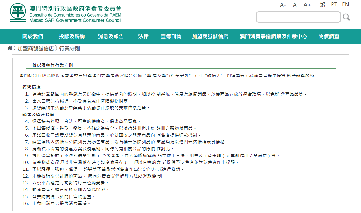為提升藥房及藥行“誠信店”的服務質素,經徵集業界意見,消委會與澳門大藥房商會聯合公佈新修訂“藥房及藥行行業守則”。該守則從經營環境、銷售及營運政策共訂定16項,包括依法與誠信經營;保持經營場所與存放商品環境的衛生與安全;確保商品來源途徑與質素;承諾回收已證實或疑似有問題的商品及設退款機制;清楚及準確標示出售商品的價格;商品的優惠資訊須同時列有原價以供對比;為消費者提供適當諮詢服務,以及對消費者購買記錄及個人資料遵守保密原則等作出規定。