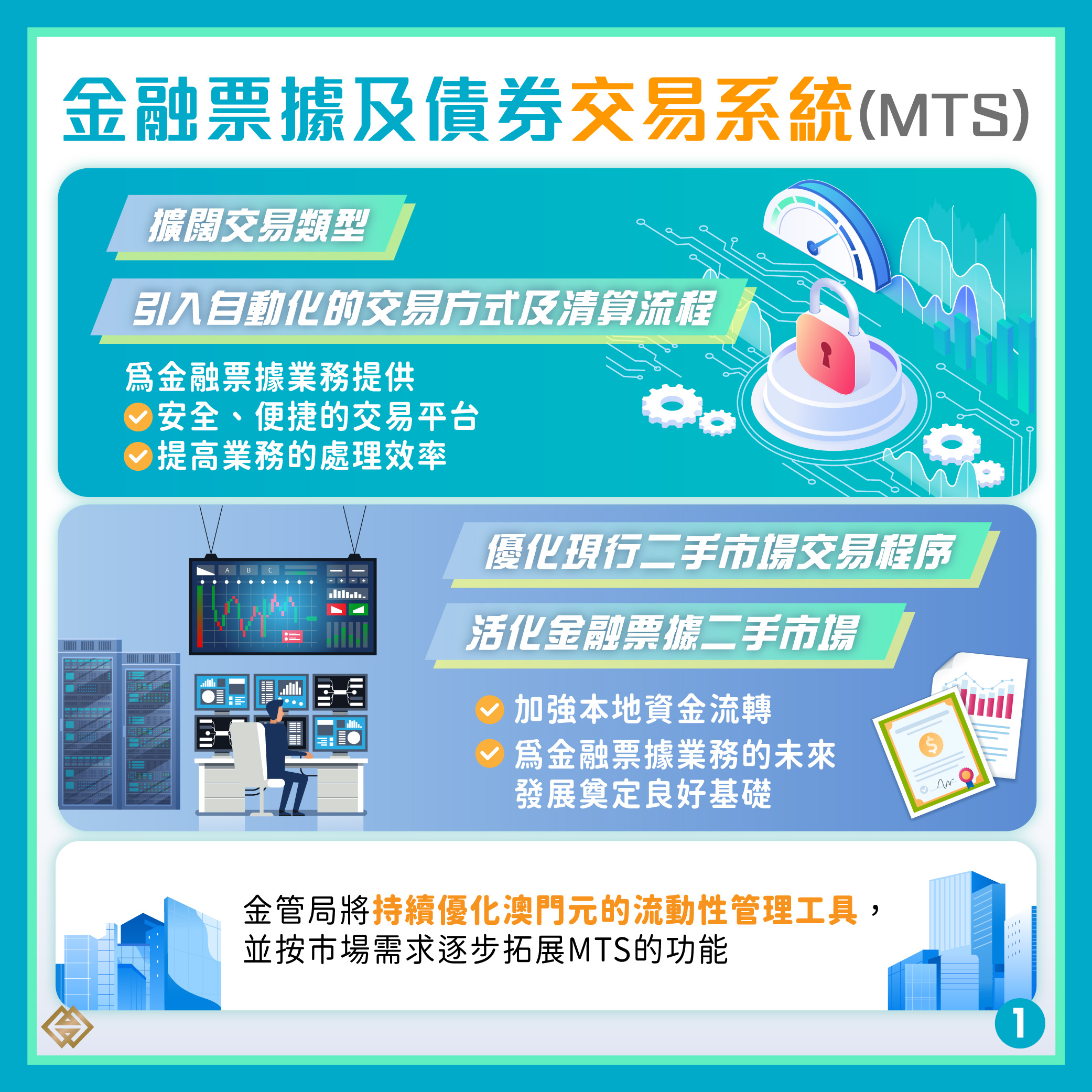 澳門金融管理局完成構建全新的金融票據及債券交易系統(Monetary Bills and Notes Trading System, MTS),引入自動化的交易方式及清算流程,提高金融票據交易效率,並活化金融票據二手市場,加強本地資金流轉,促進同業間善用多元化的貨幣市場工具。