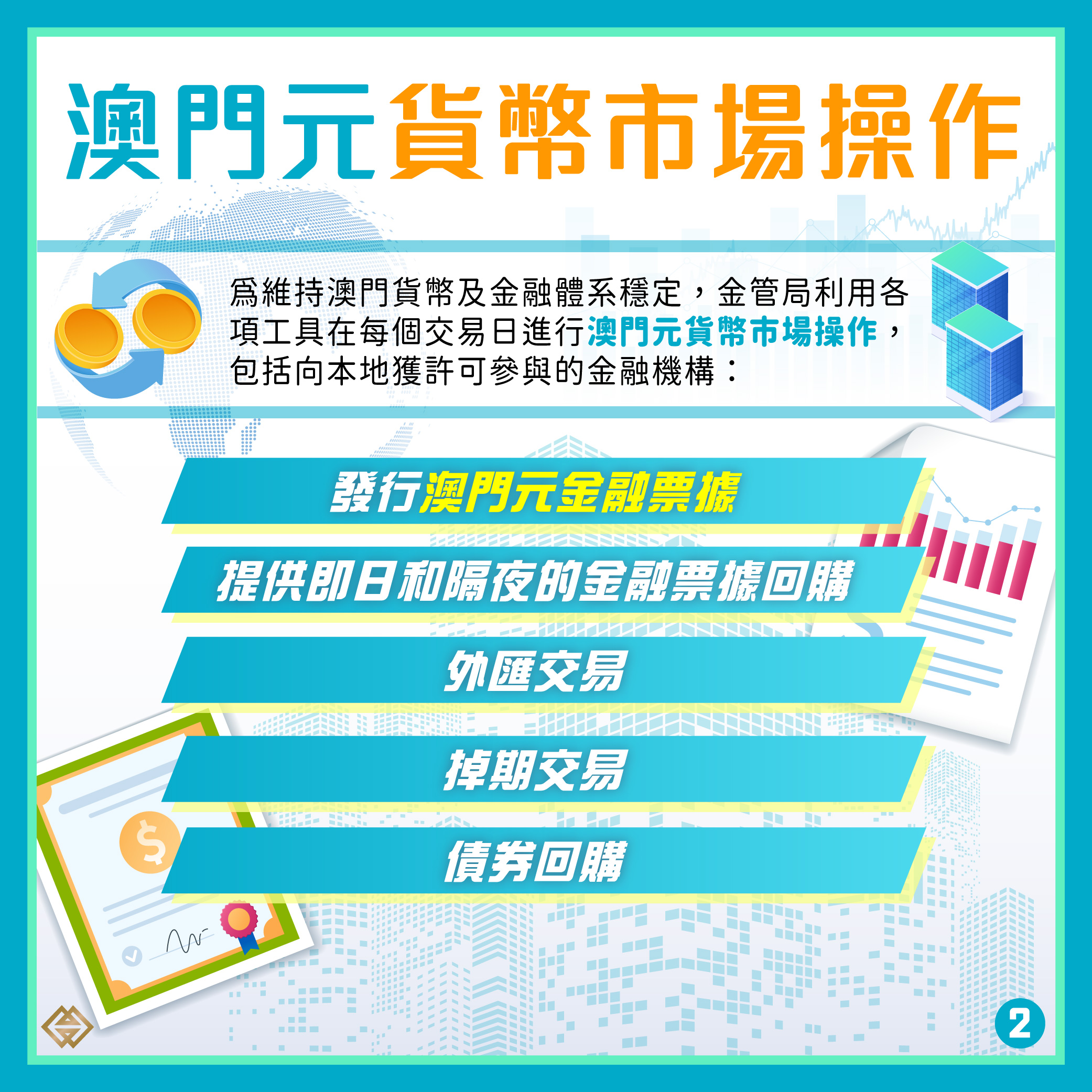 其中,金融票據是金管局發行的優質短期貨幣市場工具,具央行債務證券性質,主要用以調節金融體系內澳門元流動資金。金融票據息率在澳門元與港元的聯繫匯率機制下,水平與香港銀行同業拆息相約,具市場競爭力。金融機構亦可透過與金管局敍做即日和隔夜的金融票據回購協議借取澳門元,以更靈活管理其澳門元流動資金。