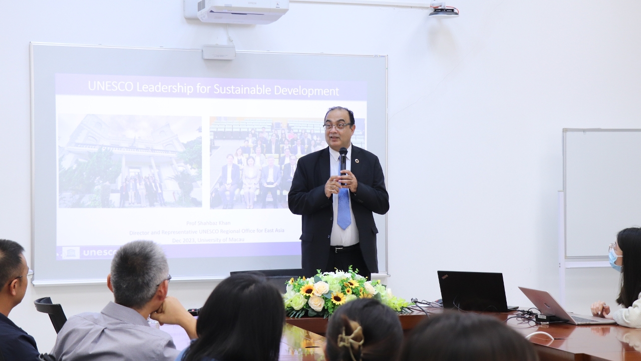 聯合國教科文組織駐華代表處代表夏澤翰(Shahbaz Khan)今(12)日率代表團訪問澳門大學,獲澳大校長宋永華熱情接待並進行座談交流。夏澤翰亦以“聯合國教科文組織在可持續發展中的作用”為題在澳大進行演講。