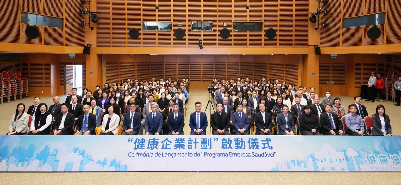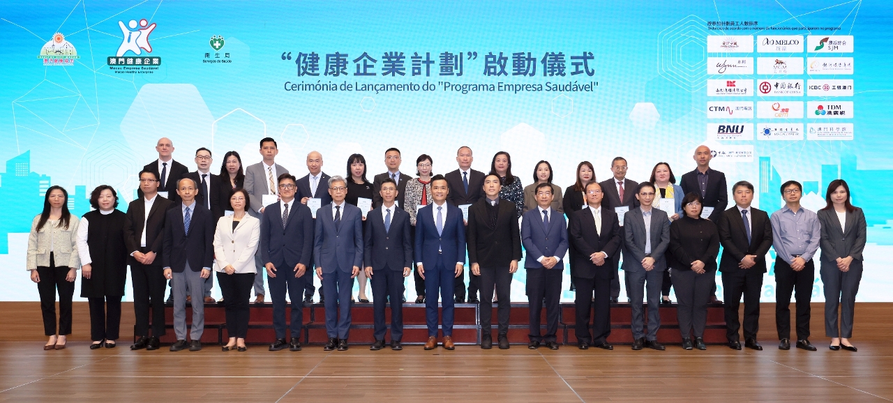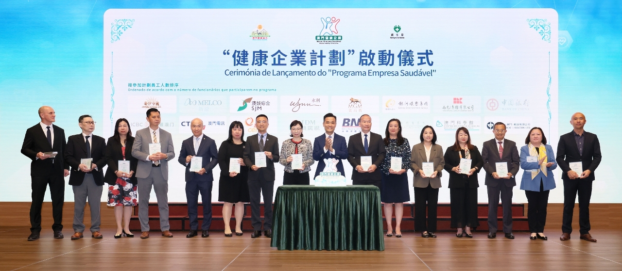 日前健康城市委員會及衛生局啟動了“健康企業計劃”,由衛生局羅奕龍局長率領本澳15家首批參與計劃的企業代表,包括:澳門科學館穆欣欣董事長、澳門廣播電視股份有限公司執行委員會袁泳貴委員、澳門自來水股份有限公司王榮集副總經理、澳門電訊有限公司行政及人力資源陳淑嫻總監、澳門電力股份有限公司人力資源及可持續發展部兼員工關係及人才管理科陸希蕾高級經理、南光(集團)有限公司人力資源共享服務中心黃則平副經理、澳門中銀區華安分行業務總監、工銀澳門人力資源部(教育培訓部)黃敏賢總經理兼康樂委員會理事長、大西洋銀行股份有限公司採購及總務部梁敬偉主管、永利渡假村(澳門)股份有限公司永利皇宮人力資源部劉德明副總裁、金沙中國有限公司人力資源部李嘉寶副總裁、美高梅人力資源余婉瑩執行副總裁、新濠博亞娛樂有限公司保安部阮天博營運副總裁、銀河娛樂集團工作場所健康及安全唐子偉副總裁、澳娛綜合度假股份有限公司首席企業事務沈銘義總監等一同為“健康企業計劃”進行啟動儀式。