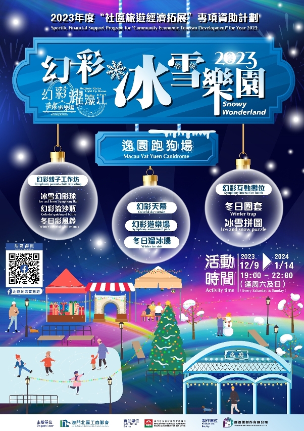 旅遊局支持的延伸活動“幻彩冰雪樂園”於上周六(9日)啟動,在逸園賽狗場設置仿真 “溜冰場”、燈光裝置、遊樂場、親子工作坊及互動遊戲,吸引一眾家長帶同子女到場體驗。“幻彩冰雪樂園”於2023年12月9日至2024年1月14日期間逢周六日晚上7時至10時開放。