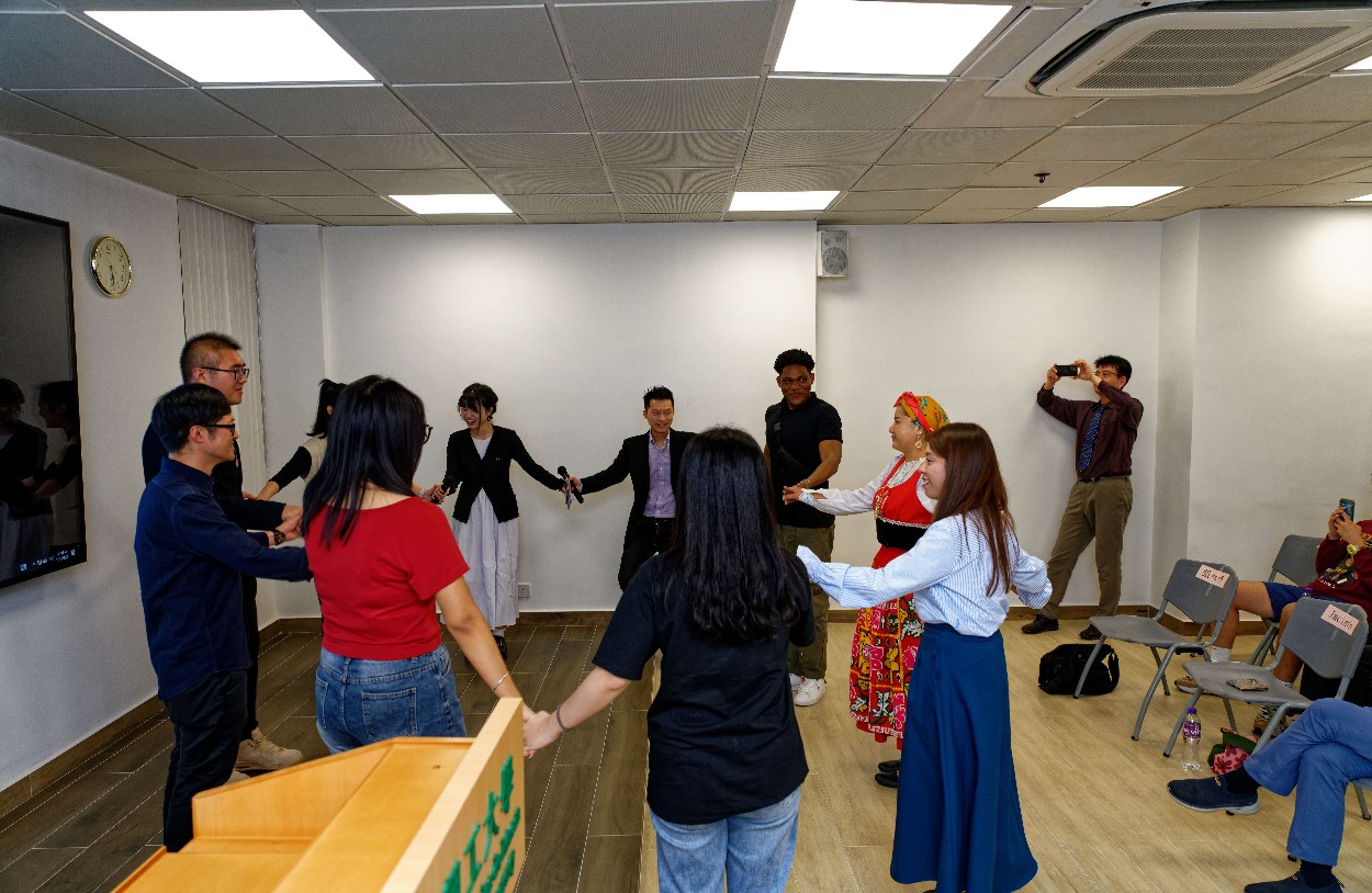 在導賞分享會上, Jacinta帶領在場的嘉賓和同學即席跳葡萄牙土風舞,身體力行感受非遺的活力,參展學生向來賓介紹了展覽的內容和理念,努力和創意讓澳門的非遺文化更加充滿生機和活力,也為澳門“一基地”建設和文遺創新增添了新色彩。
