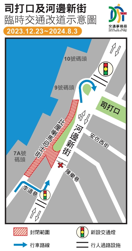 配合內港南雨水泵站及下水道工程的推進,介乎李道巷與南舢舨碼頭之間一段比厘喇馬忌士街,以及河邊新街近水字巷的中央調頭車道,於12月23日(周六)至2024年8月3日實施封閉交通,李道巷亦會臨時實施反方向行車,上述路段的上落客貨位亦會禁止車輛停泊,其他的臨時交通措施還包括禁止車輛由李道巷右轉入河邊新街、介乎陳樂巷與司打口之間一段河邊新街實施雙向行車巴士方面則維持現有安排。