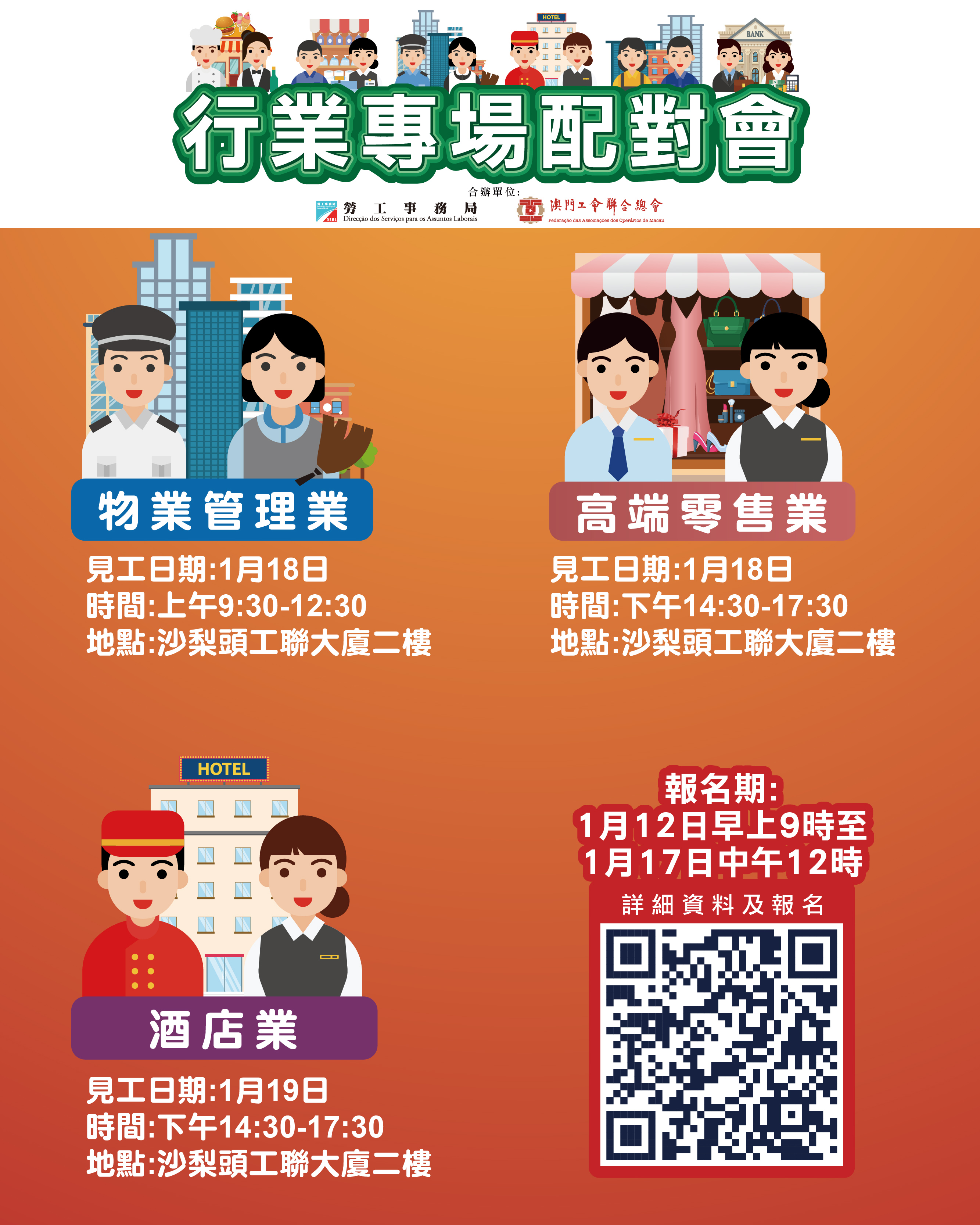 為協助有求職需求的澳門居民盡快就業,以及為緩解業界的人資需求的壓力,勞工事務局與澳門工會聯合總會合作1月第三周舉辦3場行業專場配對會,合共提供185個空缺,報名日期為1月12日上午9時至1月17日中午12時。
