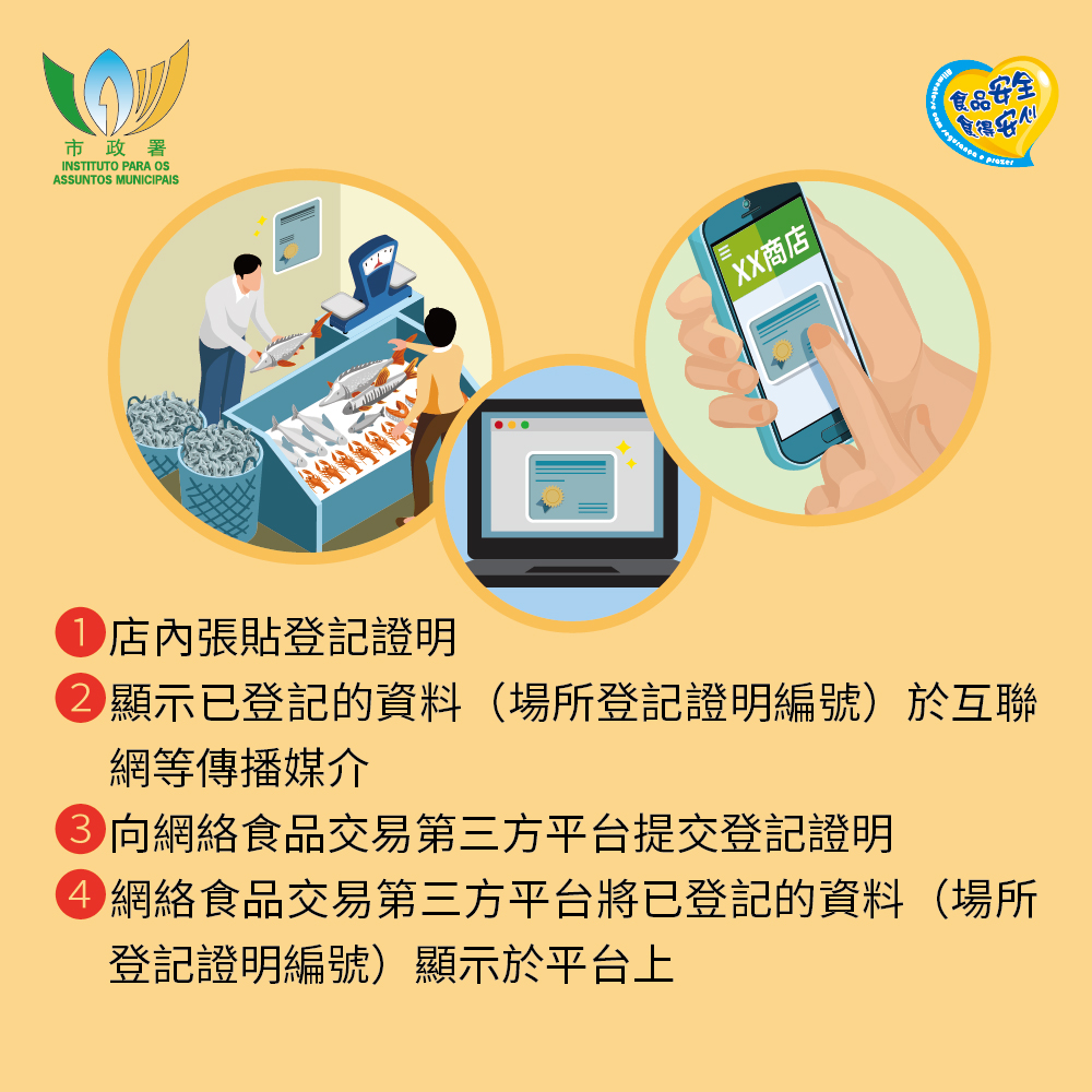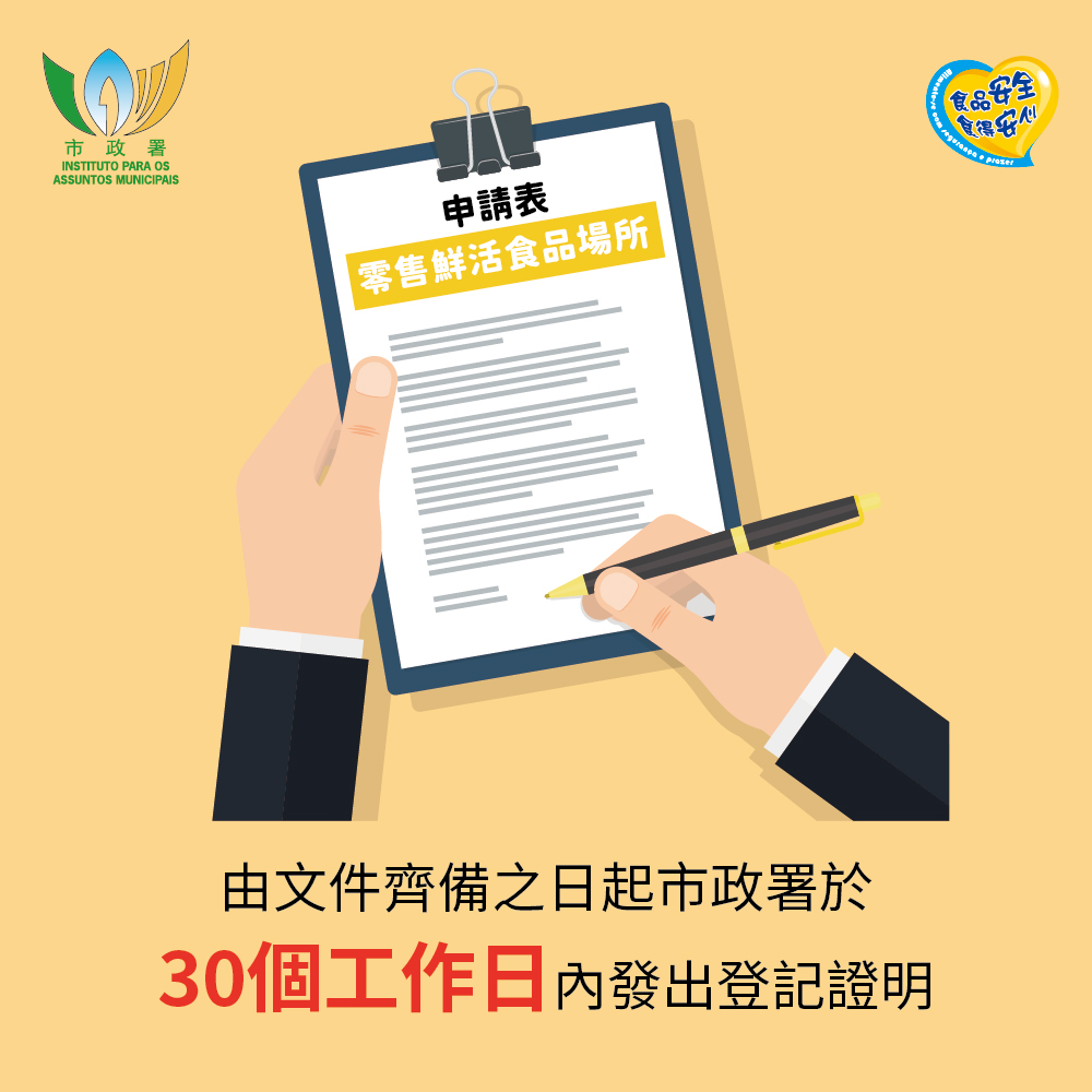 市政署提醒,在登記制度生效後零售鮮活食品場所必須在開業前向市政署提出登記申請,並在獲發登記證明後,方可向公眾開放。由文件齊備之日起市政署於三十個工作日內發出登記證明。商戶在領有登記證明後,須將登記證明張貼於場所顯眼處;如利用互聯網或社交平台進行宣傳,亦須將登記的資料上載於各網絡平台上。讓消費者在選購鮮活食品時掌握更清晰資訊,保障自身權益。