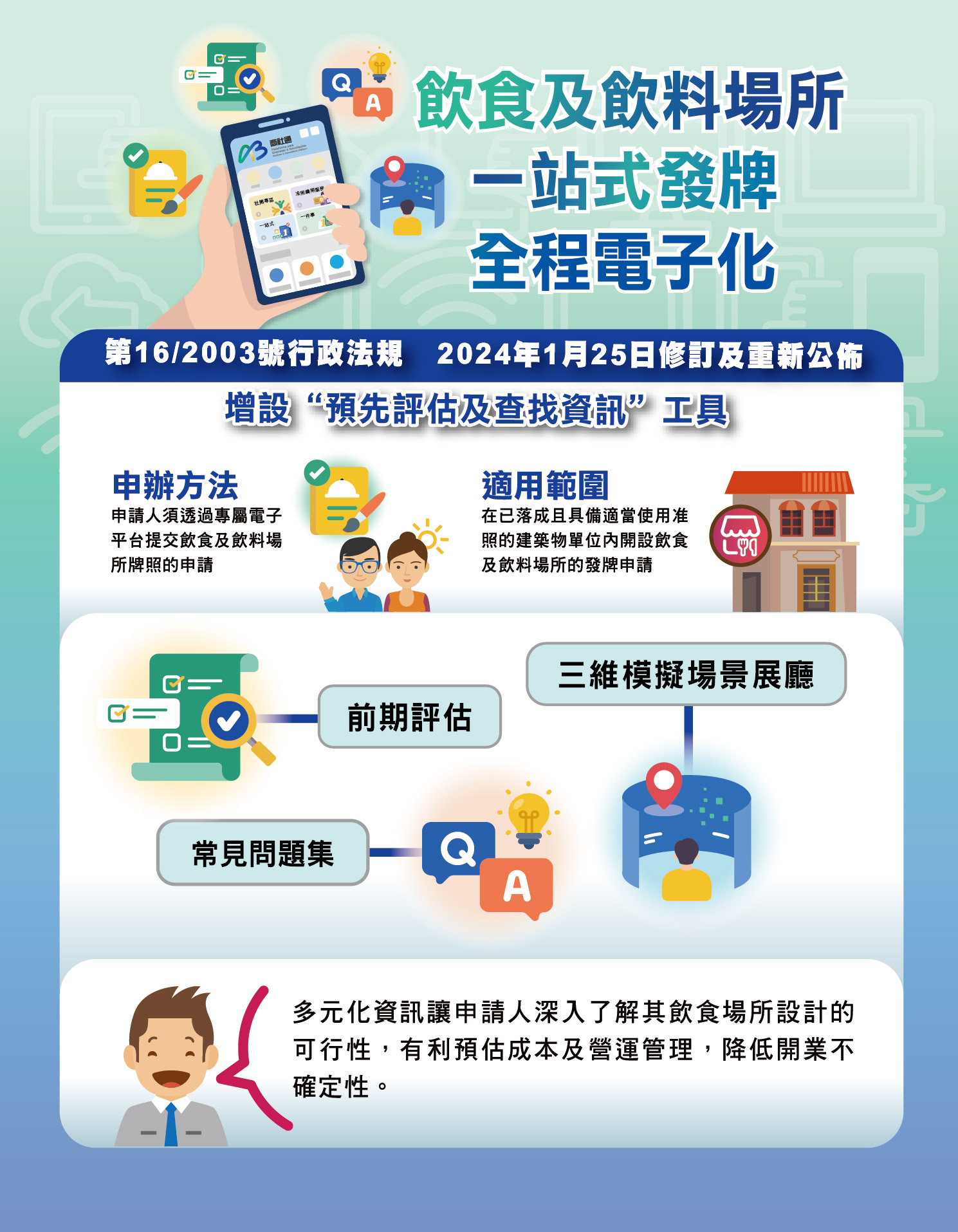 第16/2003號行政法規《飲食及飲料場所一站式發牌程序》已透過2024年1月15日公佈的第2/2024號行政法規作出修訂,並於2024年1月25日生效。