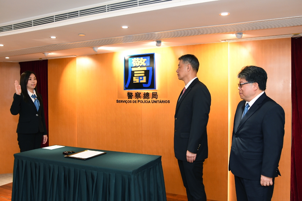 今(1日)警察總局舉行金融情報辦公室主任及副主任就職儀式,由警察總局梁文昌局長主持及監誓,並在三位局長助理、局長辦公室協調員及各部門主管見證下,金融情報辦公室朱婉儀主任及馮婉琪副主任正式宣誓就任。