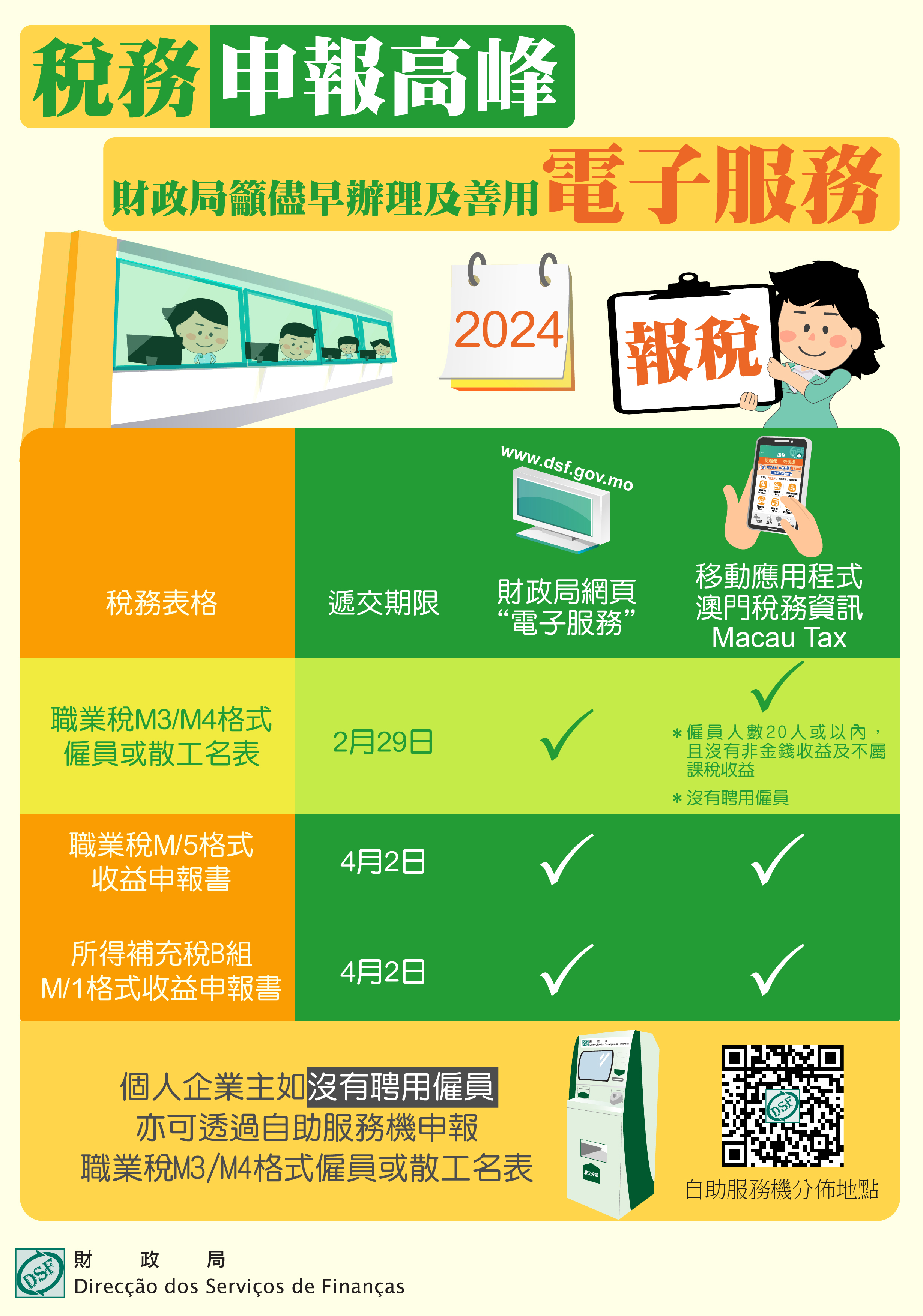 除可於辦公時間星期一至五上午9時至下午6時親臨財政局三個辦公地點:南灣財政局總局大樓、黑沙環政府綜合服務大樓、氹仔離島政府綜合服務中心,為便利市民及免卻排隊輪候,職業稅M/5格式收益申報書、所得補充稅B組M/1格式收益申報書可透過財政局網頁之“電子服務”、移動應用程式“澳門稅務資訊Macau Tax”進行申報。