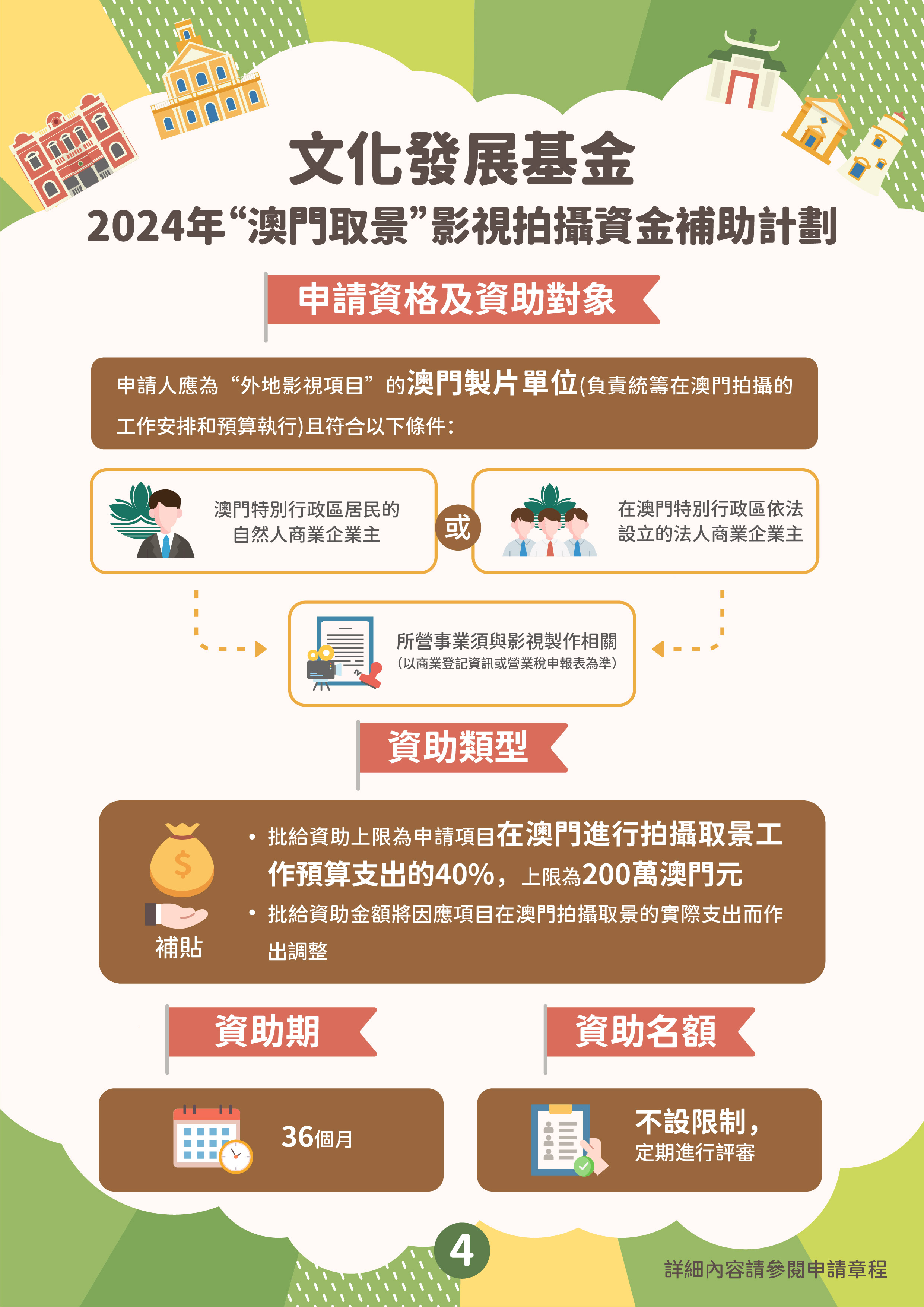 “澳門取景”影視拍攝資金補助計劃的目的是吸引外地拍攝團隊到澳門取景,通過影視作品宣傳推廣澳門形象,提升澳門的國際知名度,並為本地影視企業提供更多參與拍攝外地影視作品的機會。資助計劃接受在申請期開始前(即2024年2月6日前)、尚未開展在澳門取景拍攝工作且在澳拍攝的日數不少於3天的外地影視項目,由外地拍攝團隊主導並來澳參與拍攝工作。資助申請須由作為澳門製片單位的澳門商業企業主提出,其所營事業須與影視製作相關。獲資助的影視項目須在資助期內完成公開播放,公映版本的片長及片中出現澳門取景點的時長,須符合章程規定的時限要求。批給資助上限為申請項目在澳門進行拍攝取景工作預算支出的40%,上限為200萬澳門元。