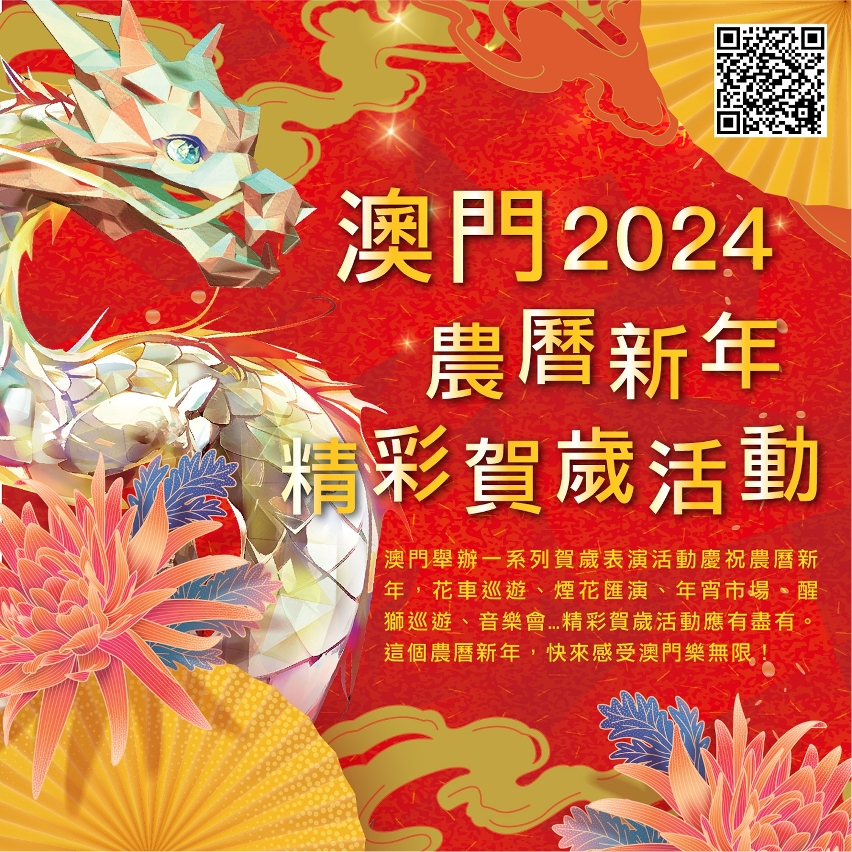 由文化和旅遊部港澳台辦公室、澳門特別行政區政府文化局、山東省文化和旅遊廳及青海省文化和旅遊廳合辦,文化和旅遊部民族民間文藝發展中心承辦的“歡樂春節系列活動——2024年新春賀歲活動”,將於大年初一至三在澳門多處舉行賀歲演出活動,並設特色攤位,與眾同樂;“樂韻悠揚大三巴”音樂會將由澳門樂團及澳門中樂團於2月14日、17日及24日傍晚6時及7時呈獻多首樂曲。新春期間,文化局呈獻“神龍開盛紀 鏡海舞霓虹”——新春系列活動,多個文化場館如常開放,專題展包括“吉祥殊勝——故宮與扎什倫布寺珍藏文物展”、“康迪達‧赫弗:宏空之境”展覽、“海絲起點 清新福建——非物質文化遺產展演”及“土火淬煉——山東省和青海省黑陶藝術展”等。