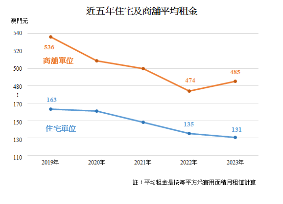 按季分析,2023年第4季全澳住宅單位的平均租金為132元,按季上升0.8%;商舖單位的平均租金與上季相同,為494元;辦公室按季下跌0.7%至300元,工業單位則上升0.8%至125元。