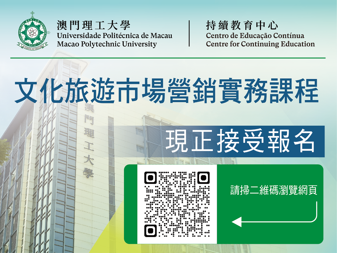 “文化旅遊市場營銷實務”課程已納入教青局持續進修發展計劃。課程資訊及網上報名請瀏覽專頁https://www.mpu.edu.mo/cec/zh/courses.html。