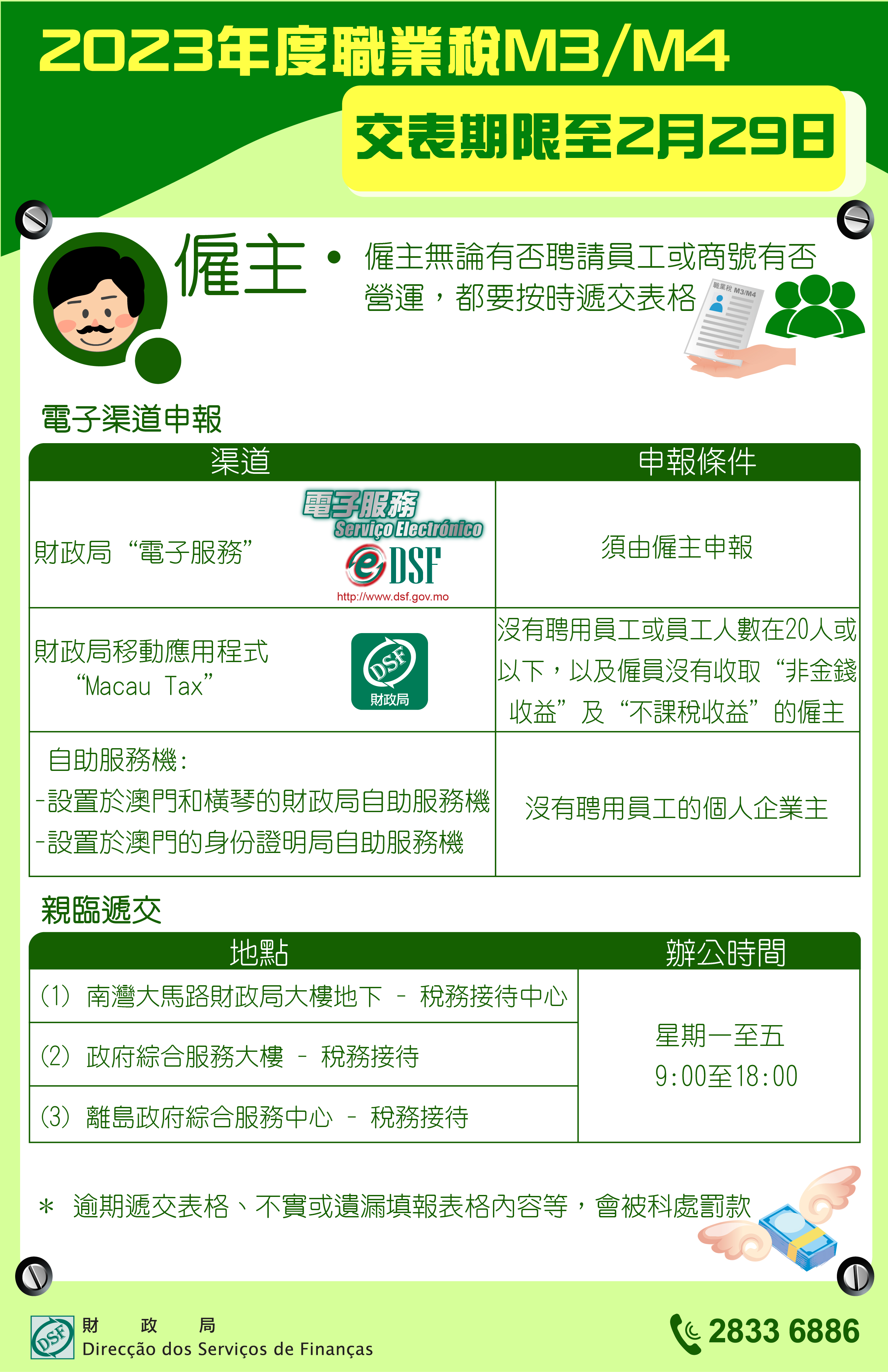 2023年度職業稅第一組M3/M4格式(僱員或散工名表)遞交期限至2月29日,僱主無論有否聘請員工或商號有否營運,均須於上述法定期限內遞交有關表格,逾期遞交表格、不實或遺漏填報表格內容等都屬行政違法,會被科處罰款。