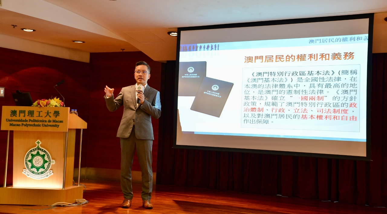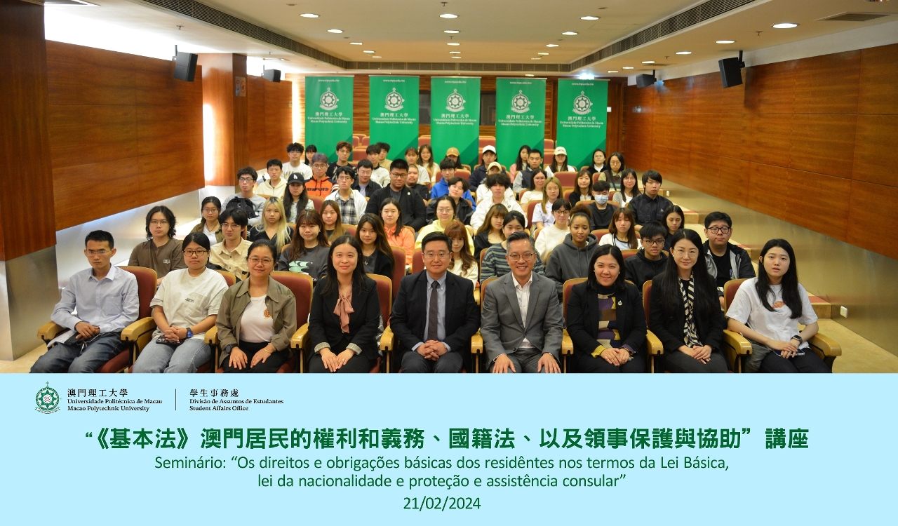 為加強大學生對《澳門基本法》、國籍法、以及領事保護服務的認識,澳門理工大學學生事務處於2月21日舉辦“《基本法》澳門居民的權利和義務、國籍法、以及領事保護與協助”講座,邀請中華人民共和國外交部駐澳門特別行政區特派員公署領事部二秘林瓏及澳門特區政府身份證明局居民身份資料廳廳長劉天德主講。澳理大語言及翻譯學院代院長張云峰、學生事務處處長劉穎欣及近百名師生出席。