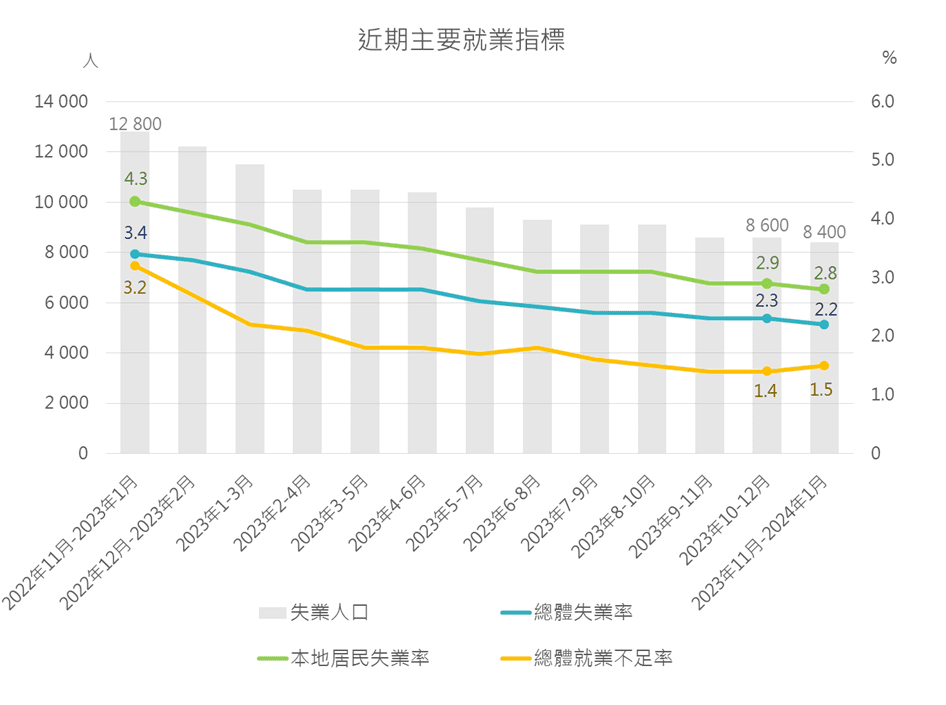 統計暨普查局資料顯示,2023年11月至2024年1月總體失業率為2.2%,本地居民失業率為2.8%。兩者均較上一期(2023年10月至12月)下跌0.1個百分點,亦已回復至2020年初的水平。總體就業不足率則微升0.1個百分點至1.5%。