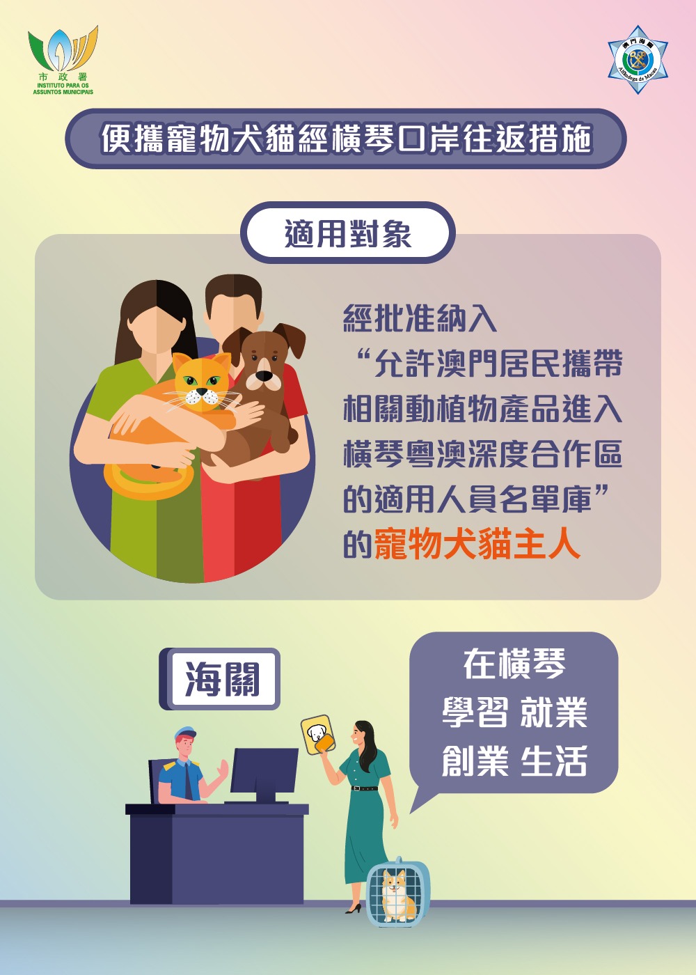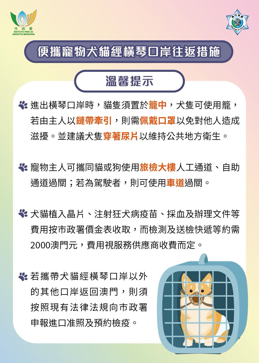 市政署提醒寵物主人進出橫琴口岸時,所攜貓隻須置於籠中,犬隻可使用籠,若由主人以鏈帶牽引,則需佩戴口罩以免對他人造成滋擾。並建議犬隻穿著尿片以維持公共地方衛生。