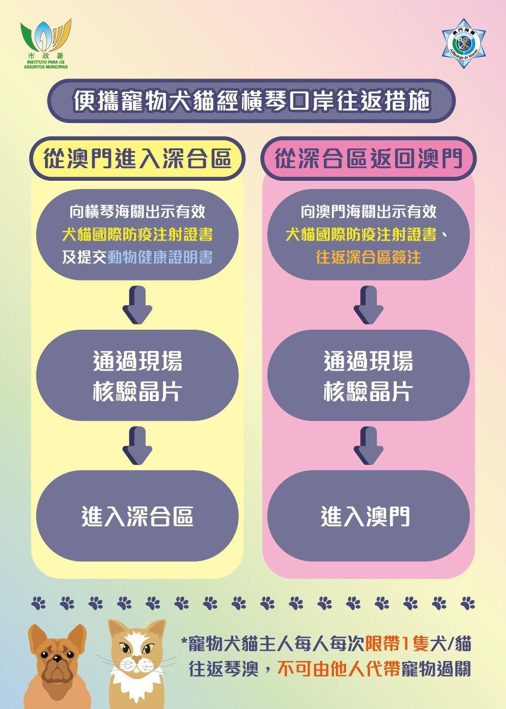 此外,寵物主人可攜同貓或狗使用旅檢大樓人工通道、自助通道過關;若為駕駛者,則可使用車道過關。若攜帶貓犬經橫琴口岸以外的其他口岸返回澳門,則須按照現有法律法規向市政署申報進口准照及預約檢疫。