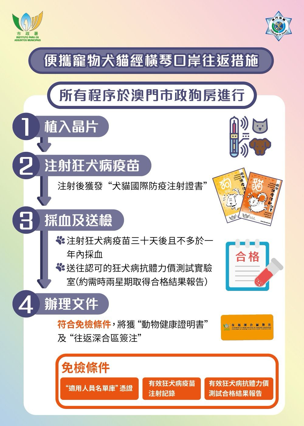 申請人須帶同犬貓到澳門市政狗房植入晶片、注射狂犬病預防疫苗,並於注射疫苗三十天後且不多於一年內採血,進行狂犬病抗體力價測試,當具有效狂犬病疫苗記錄和有效狂犬病抗體力價測試合格結果後,可辦理“動物健康證明書”和“往返深合區簽注”。