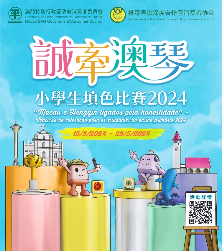作為“國際消費者權益日”系列活動之一,澳門特別行政區政府消費者委員會(下稱澳門消委會)與橫琴粵澳深度合作區消費者協會(下稱深合區消協)合辦“誠牽澳琴”小學生填色比賽2024,旨在通過活動,增加學生對澳門與橫琴的消費資訊、兩地誠信店品牌以及澳琴消費維權一體化的認識。澳門區比賽由即日起至2024年5月23日接受報名及遞交作品,凡於本澳就讀的小學生均可參加。有關報名表及填色稿可於消委會網頁(https://www.consumer.gov.mo)下載,作品完成後於收件期辦公時間內遞交至消委會辦事處。