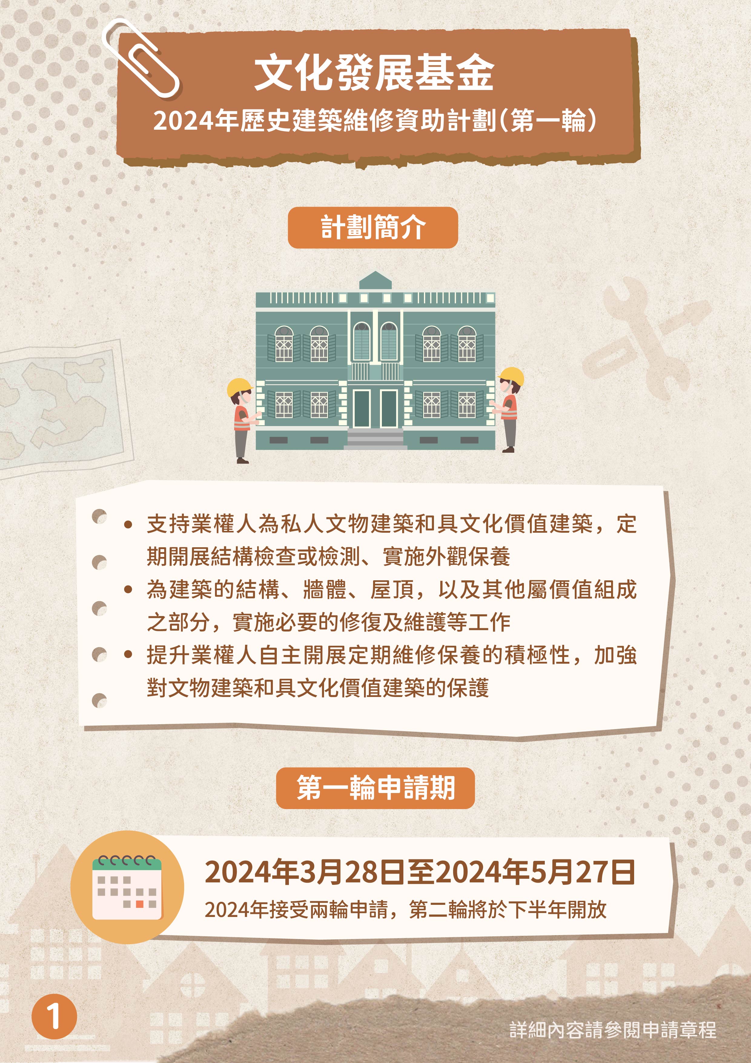 “歷史建築維修資助計劃”今年將推出兩輪申請,第一輪申請期由2024年3月28日至5月27日。資助範圍包括在申請期開始前尚未開展維修工程的被評定、待評定的不動產及具文化價值的不動產,並須由不動產的業權人或獲授權人提交申請;在不動產無法釐清業權或被認定為業權人無法聯繫的情況下,才可由佔有人或持有人提交申請。