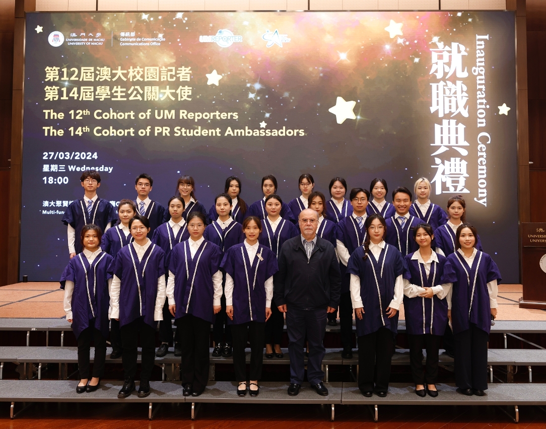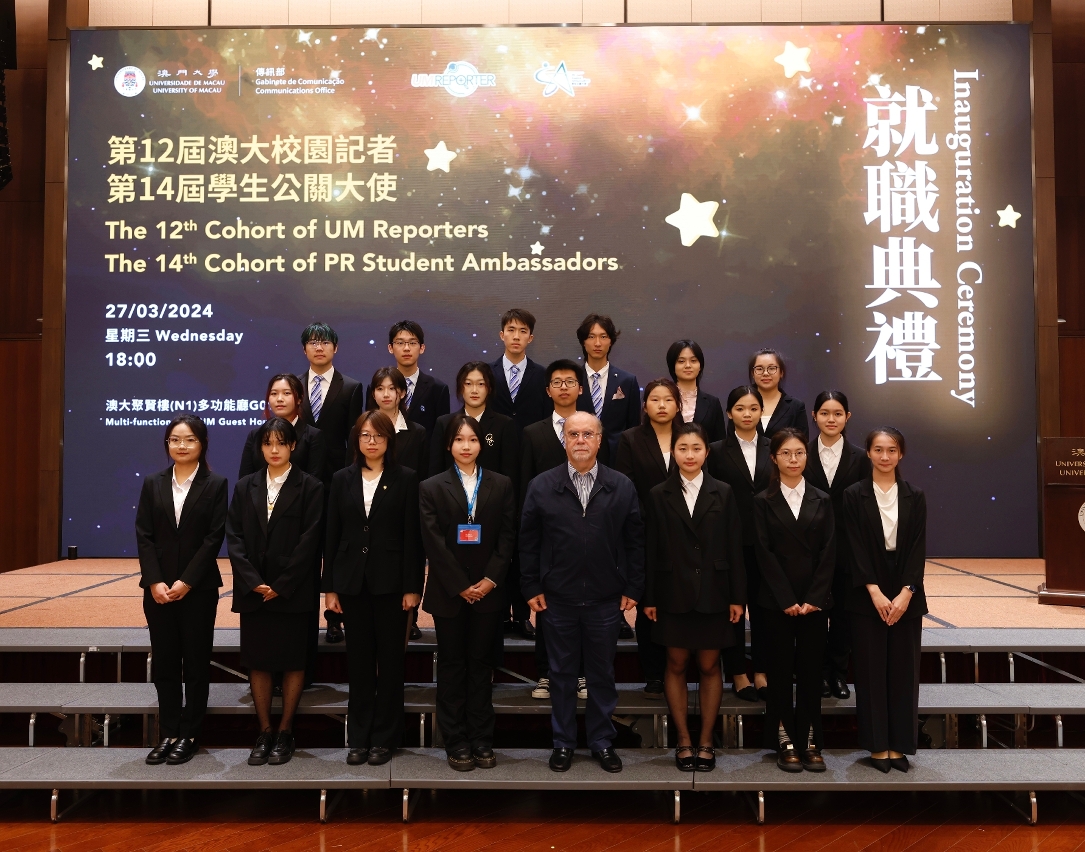 澳門大學第12屆校園記者和第14屆學生公關大使舉行就職典禮。今屆共有63名校園記者和學生公關大使就職,並有20名表現突出的學生獲頒發“十大傑出校園記者"及“十大傑出學生公關大使"獎狀,同場亦向“融媒體學生實踐平台"合作單位頒發證書。