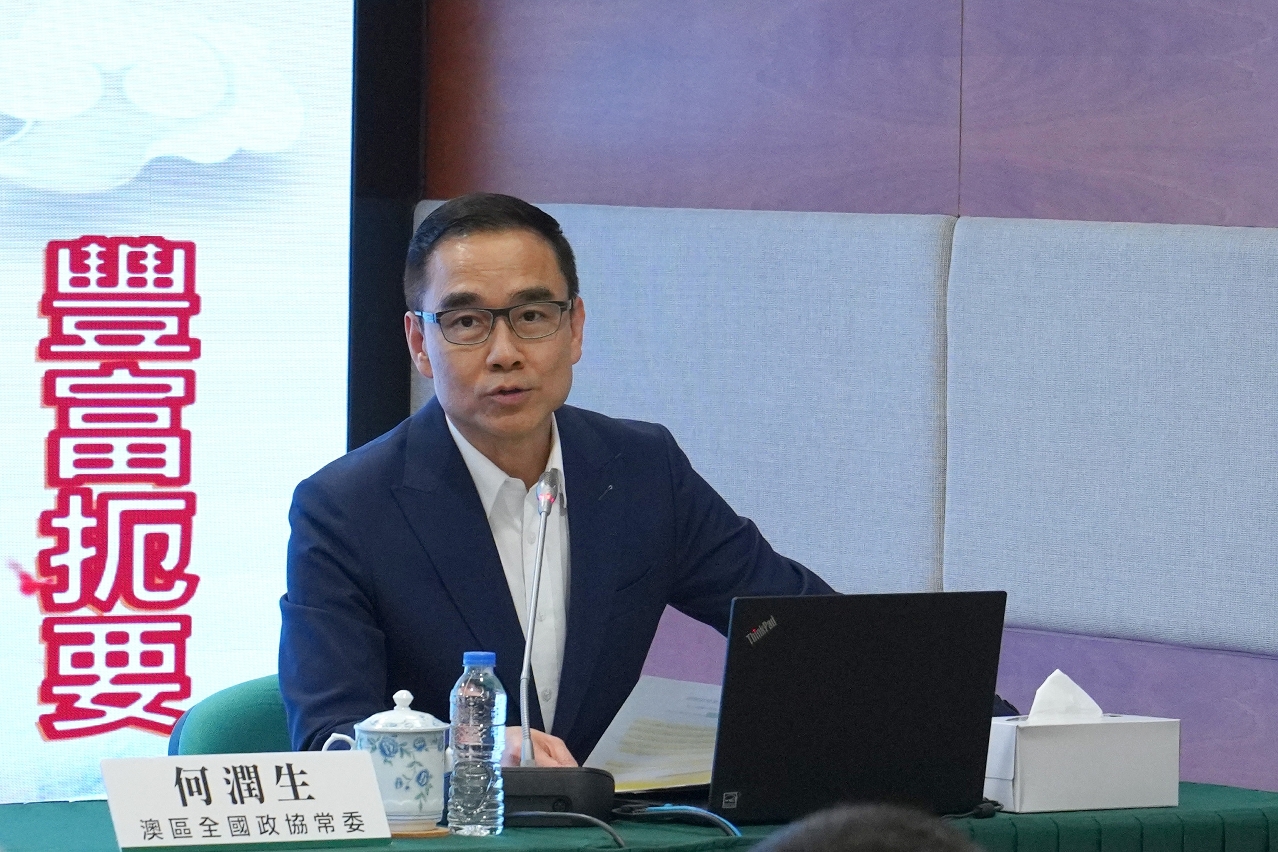 何潤生以“新質生產力”、“科教興國強國”、“高質量發展”和“高水平對外開放”等關鍵詞作為切入點,闡述了全國兩會的主要內容、精神要點和熱門議題;並且圍繞“團結奮進譜新篇”、“畫好最大同心圓”分享與會期間的學習心得體會。他寄語特區政府公務人員結合工作實際,學習貫徹全國兩會精神,準確把握國家政策和發展方向,在各自崗位上認真履行職責使命,更好地執行中央的決策部署和特區政府的施政工作,爭取以繁榮景象、喜慶氛圍和新的發展成果迎接新中國75周年華誕和澳門回歸祖國25周年。