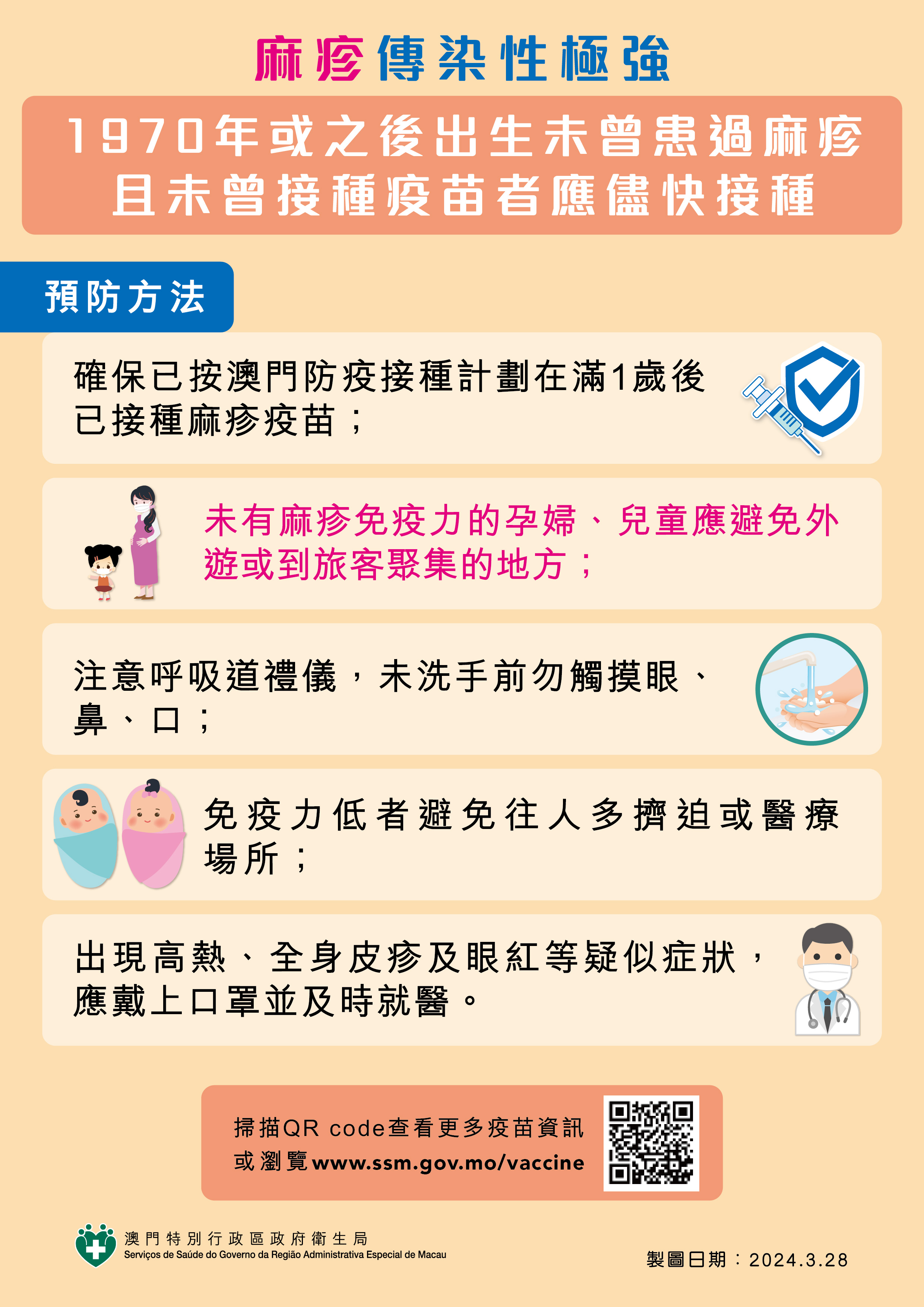 現時全球各地的麻疹流行有不同程度的上升,目前本澳雖不是麻疹流行地區,但隨著旅客訪澳及居民外遊數量增加,若本澳出現麻疹輸入個案,由輸入個案引起本地再傳播的風險將會增加。衛生局再次呼籲1970年或之後出生未曾患過麻疹且未曾接種疫苗的居民儘快完成麻疹疫苗接種,本澳居民及已獲准在本澳長期逗留的非澳門居民(如外僱、學生等)可透過預約(網址為https://www.ssm.gov.mo/mmrrs)在衛生中心或衛生站安排接種,非上述澳門居民及其他人士亦可自行到本澳私人醫療機構查詢接種事宜。