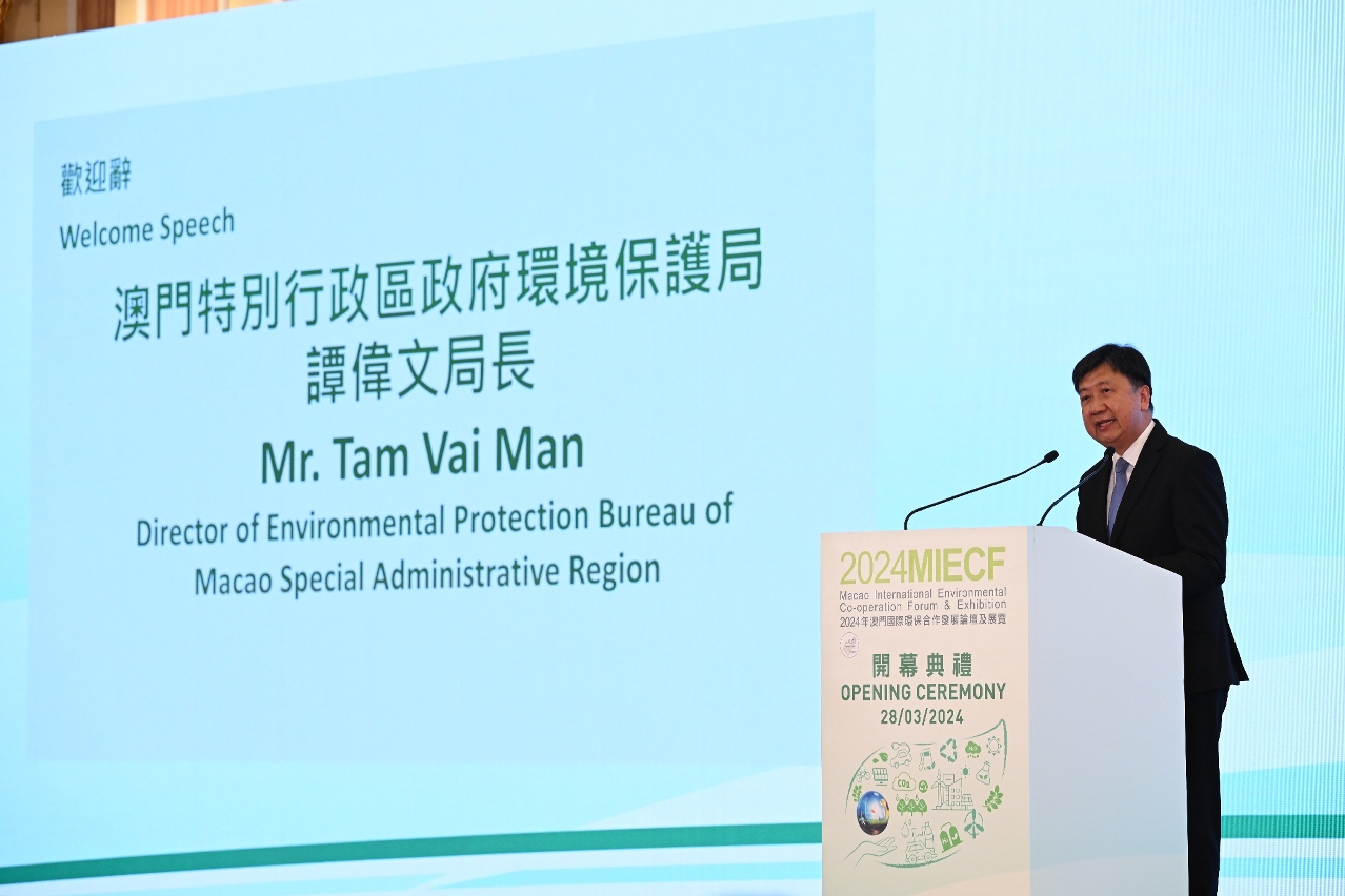 開幕典禮上,澳門特別行政區環境保護局譚偉文局長致辭時表示,為配合國家實現“雙碳”目標,澳門特區政府已從清潔能源替代、綠色交通、節能減排、減廢回收等方面推行各項減碳措施,並於去年公佈了《澳門長期減碳策略》,作為澳門減碳工作的藍圖,提出六個關鍵策略,有序推進各範疇的減碳工作,引領社會大眾共同實踐環保行為。未來澳門特區政府將繼續有序推進減碳工作,與全澳居民共同構建綠色低碳澳門。他提到環保論壇作為內地尤其是泛珠三角地區與國際交流合作的重要平台,緊扣國家和澳門特區的環保政策和方向,配合國家“十四五”規劃、《粵港澳大灣區發展規劃綱要》、澳門特區政府“二五規劃”的環保目標,以及“1+4”經濟適度多元發展策略,匯聚海內外專業界別力量,深化國際環保合作。此外,展會更連續第三年成為實現“碳中和”的專業展會,發揮示範與引領作用,加快業界的綠色發展步伐。期望與會者透過本次的系列高規格專題會議、綠色論壇、項目推介會以及綠色配對等安排,掌握具前瞻性且創新的環保資訊,發掘綠色商機。特區政府將在切實推動澳門經濟高質量發展的同時,着力推動國際和區域間的綠色合作和轉型,為應對全球氣候變化作出更大貢獻。