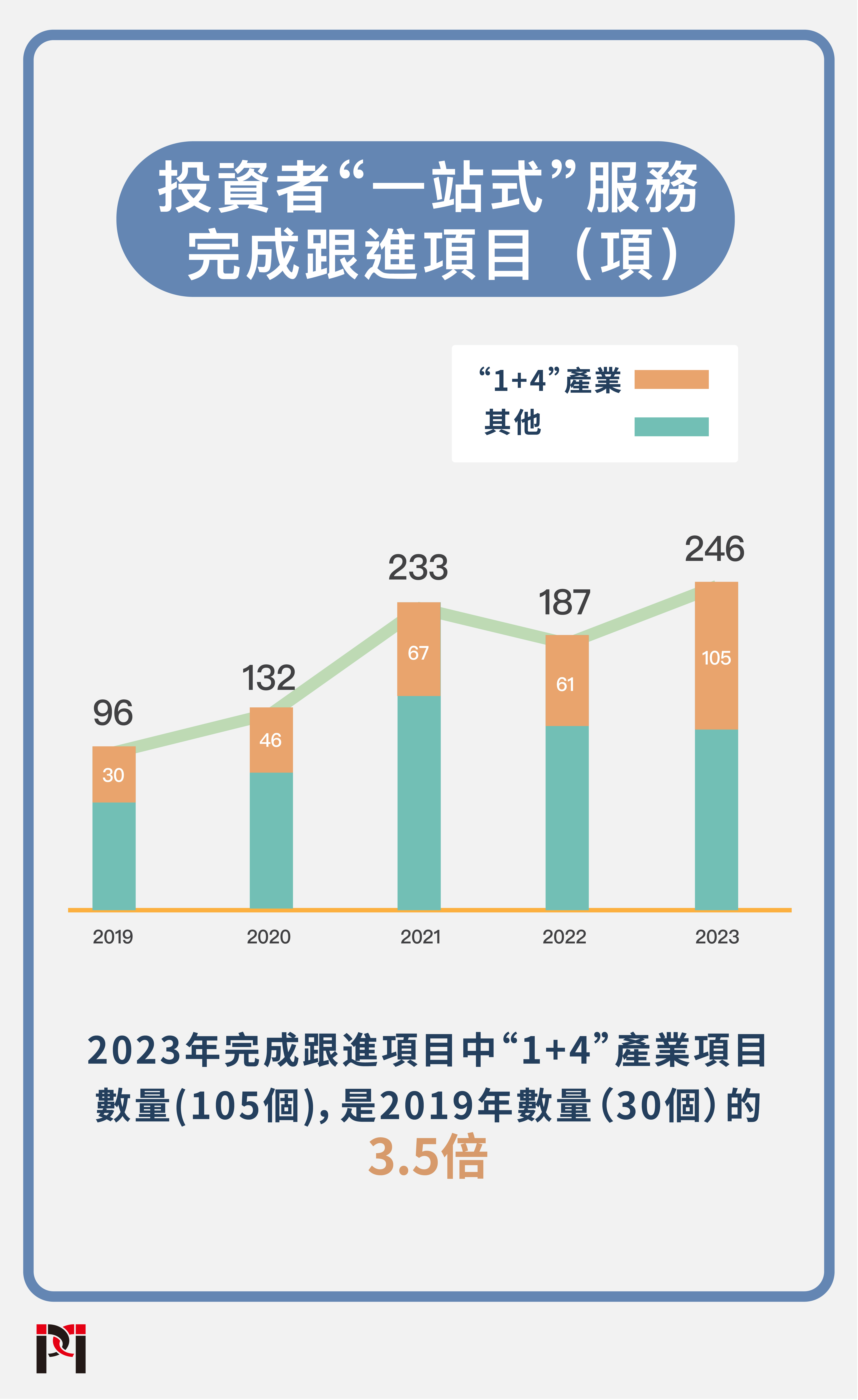 近年服務實施多項優化舉措,以回應市場產業環境變遷,包括優化“一站式”事前、事中、事後服務流程,委派專責人員“一對一”跟進項目;推出線上“投資E道”提供大灣區內地九市、葡語國家重點城市的商事程序、稅務政策等投資信息;增設“事前技術會議”,助企業理順項目開展的事前籌備;優化“投資委員會”跨部門機制,2022年起增設“事前技術會議2.0”,協調有關部門優先跟進四大產業項目,“投資委員會”現架構包括13個部門及機構,基本涵蓋“1+4”產業相關部門,集中推進落實“1+4”產業重點項目;2024年新設立深合區“事前技術會議”機制,進一步優化落實澳琴聯合招商機制;以“‘1+4’投資專班”模式,與“1+4”產業有關部門和業界合作,爭取聯動產出更多“1+4”產業投資項目及商務對接成果。
