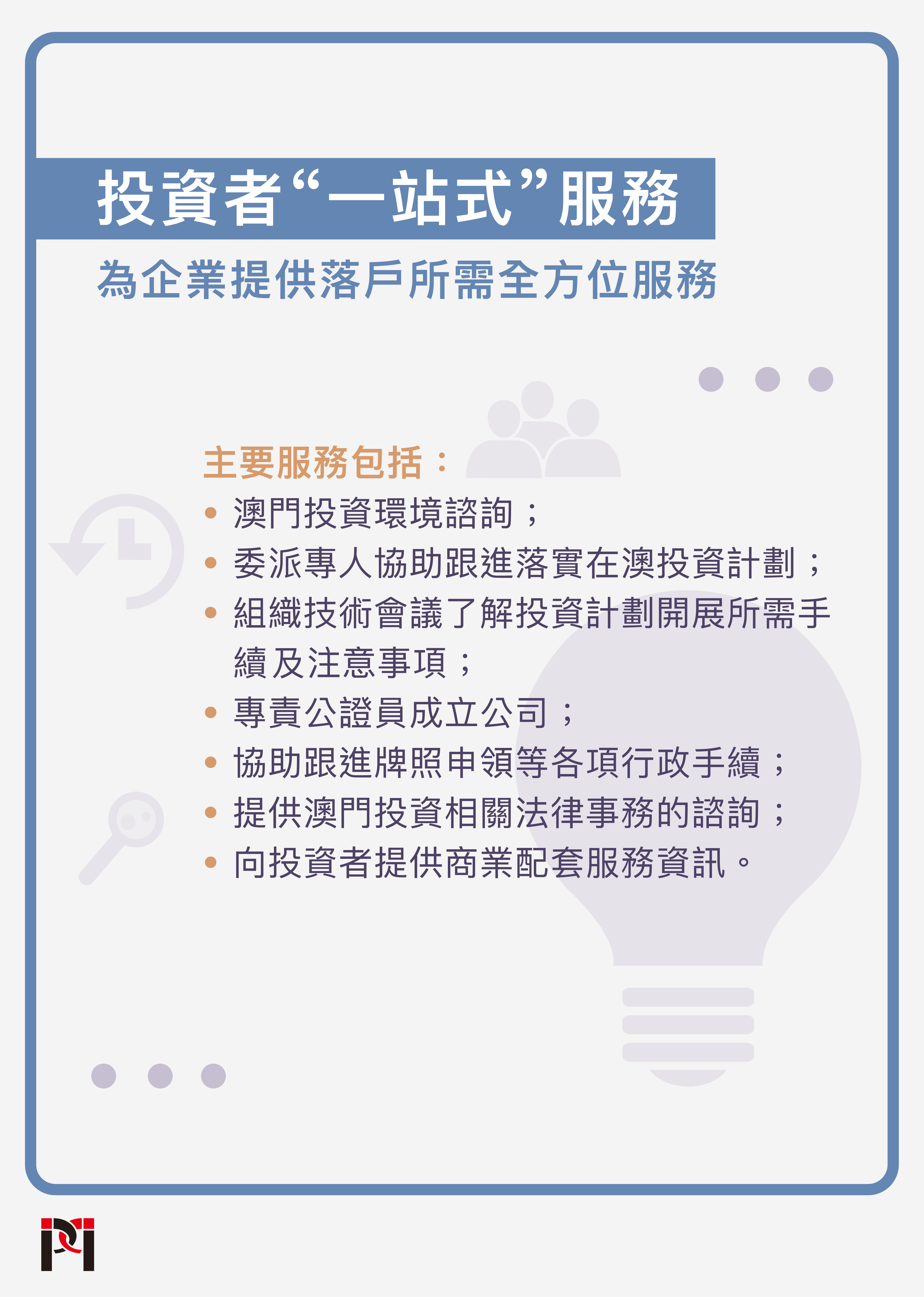 貿促局“投資者‘一站式’服務”協助海內外投資者在澳落實投資計劃,提供事前、事中、事後全流程“一條龍”服務,主要包括:事前投資環境諮詢、組織事前技術會議;事中安排專人跟進落實投資計劃、協助辦理成立公司及牌照申領等行政手續;事後定期跟蹤項目落實情況,主動關切投資者並提供適切協助,包括跟進二次投資意向、商業配對需求等。