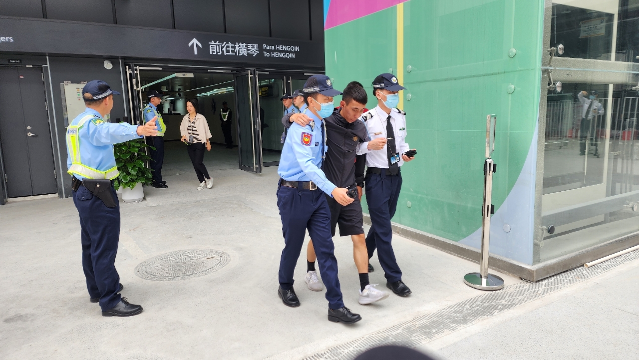 演習模擬在橫琴口岸隨車人員驗放廳一樓澳門離境大堂,1名市民裝有手提電腦之隨身背包突然起火冒煙。工作人員按照既定計劃通報澳門消防局,同時採取應急安全措施,疏散現場人士到疏散集合點。澳門消防局接到報警後,立即從行動站派遣6輛緊急救援車輛及26名人員到場進行滅火、排煙及搜救工作,並於疏散集合點為10名疏散人士進行檢查及護理,其中有1名腳踝扭傷的傷者由現場救護車模擬送往醫院治理。