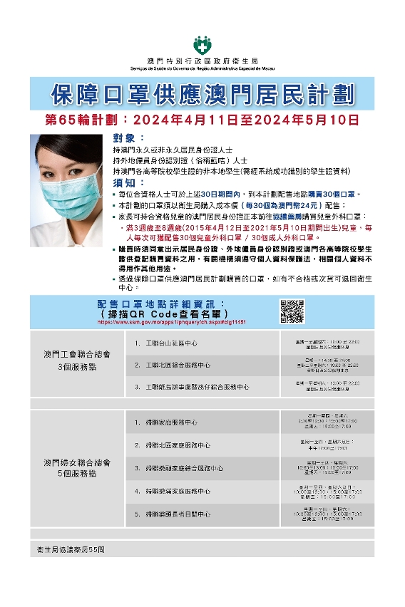 衛生局今(9)日公佈,第65輪保障口罩供應澳門居民計劃(下稱“口罩計劃”)於4月11日開始,具體如下: